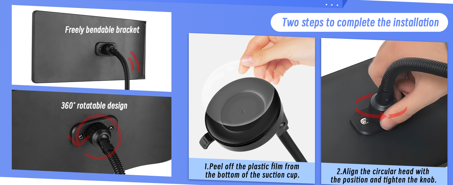 - Міцна конструкція: міцна основа та нижня присоска забезпечують виняткову стабільність, навіть якщо їх розмістити на бічних дверях вашого автомобіля, міцно закріплюючи світлову панель на місці під час використання.