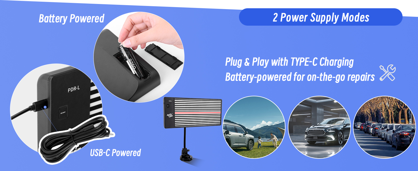 - Подвійні параметри живлення: для додаткової зручності та універсальності живіть цей продукт через кабель або акумулятор. З цією лінійною матрицею PDR вам не доведеться покладатися на інші джерела світла, такі як традиційні рефлекторні пластини, щоб використовувати її. Ви можете виконувати роботи з ремонту вм’ятин у будь-який час і будь-де.