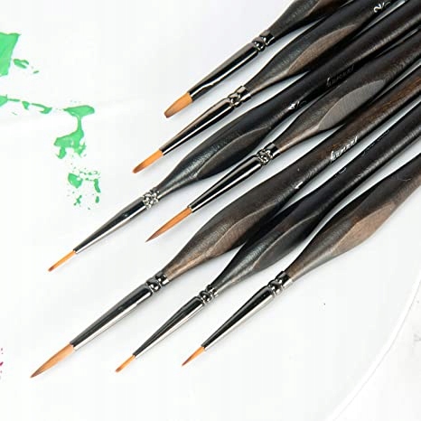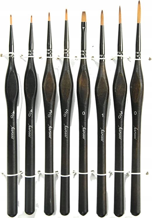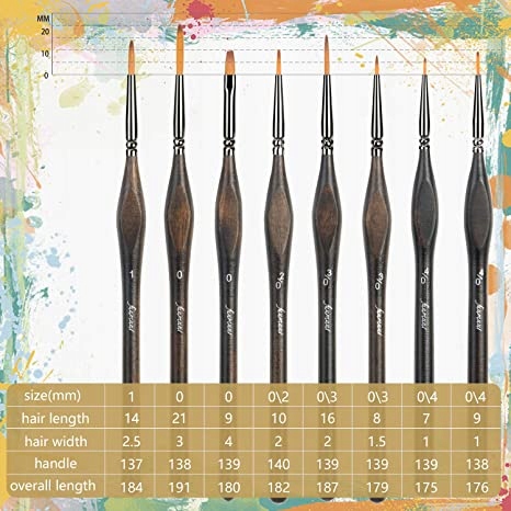 - Докладний набір пензлів: 8 різних пензлів розміром 4/0, 4/0, 3/0, 3/0, 2, 1, 0, 0, упаковані в простий поліетиленовий пакет і прикріплений еластичною стрічкою до аркуша паперу