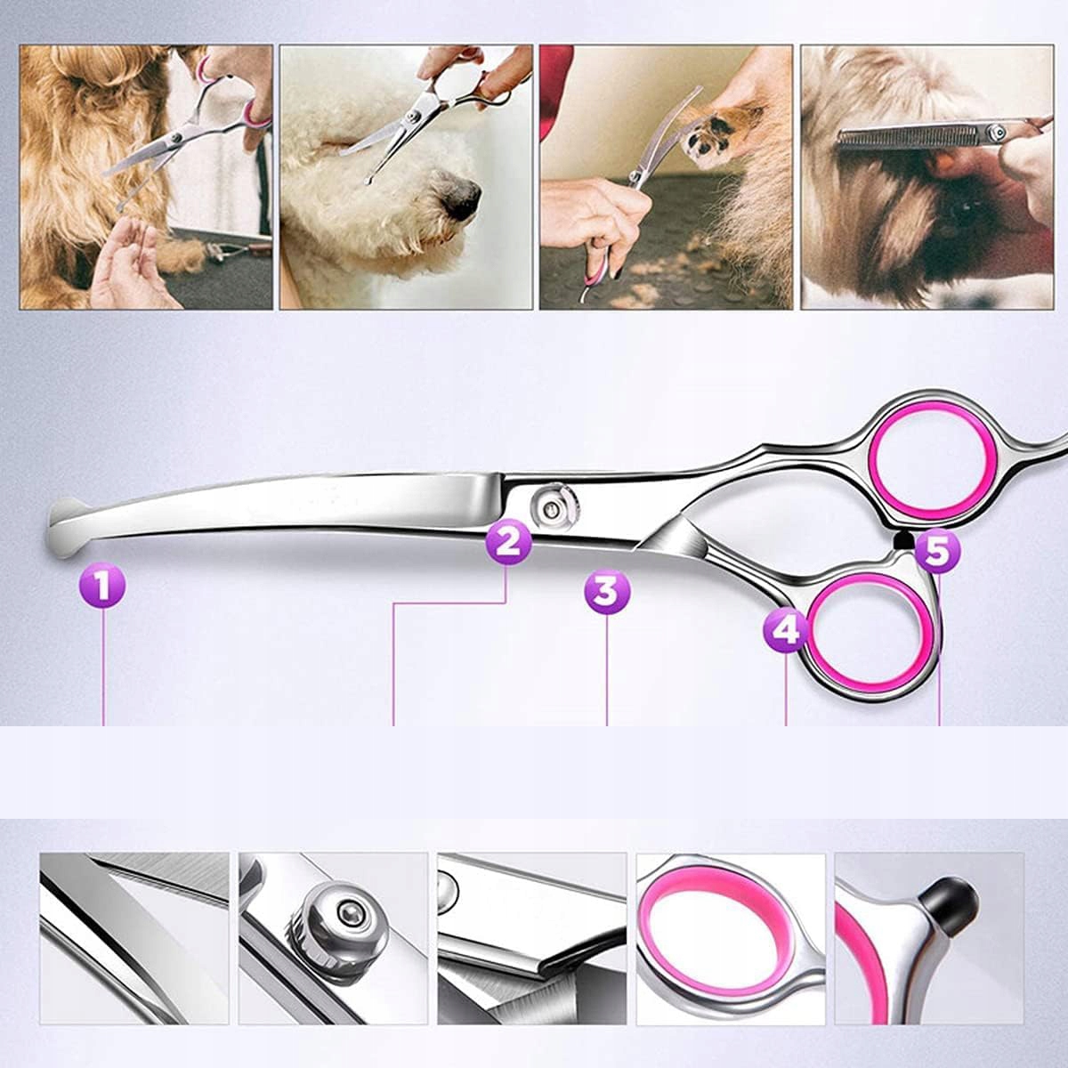 Усі ножиці мають унікальний круглий кінчик, який дозволяє безпечно стригти шерсть домашніх тварин, не боячись поранитися, особливо в чутливих областях, таких як очі, вуха та ніжки.