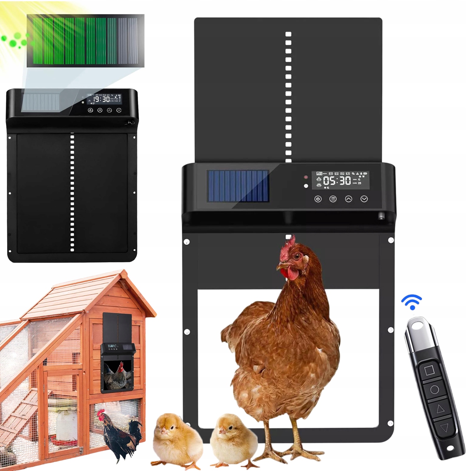 🔋+☀ 【Висока ємність акумулятора та 2 варіанти живлення】 : Цей автоматичний сонячний клапоть для курчат оснащений батареями з високою потужністю 5000 мАг та сонячними панелями з високою конверсією. Його можна стягувати в сонячній енергії в сонячні дні, що економить гроші і комфортно. Якщо ви використовуєте кабель зарядки в інших погодних умовах, вам більше не потрібно турбуватися про проблеми з зарядкою в інших погодних умовах! Взаємодія з продуктом проста та ефективна. Режим таймера (час відкриття та закриття). Режим датчика часу та світла (тимчасове відкриття/закриття підключення до датчика відкриття/закриття). Дистанційне управління можна ефективно використовувати з відстані 24-40 метрів (80-130 футів). Ви також можете вибрати управління рукою. Існує багато методів управління, тому ви можете контролювати відкриття або закриття дверей Хенхауса. 60 ° C, тому вам не доведеться турбуватися про те, чи холодно зима чи спекотне літо. Водна стійкість IP65 та здатність працювати в екстремальних погодних умовах, добре працюють під дощем, снігом та іншими екстремальними погодними умовами. Він перестає закривати і підніматися, коли виявляє, що курка проходить через двері клітки і запобігає ув'язненню курки.