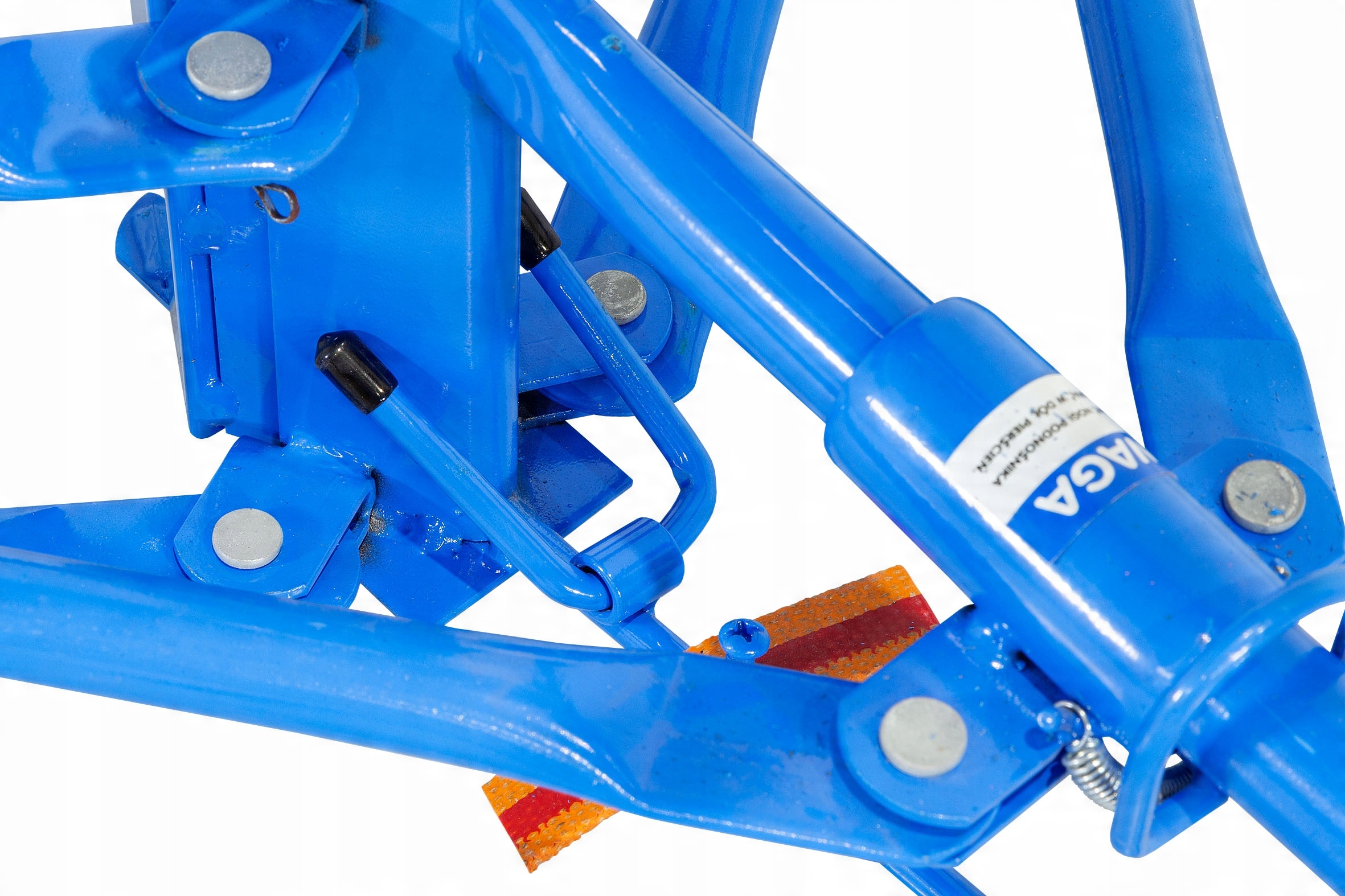 Вся конструкція пристрою виготовлена зі сталі, покритої захисним покриттям BLUE. Спеціально розроблена система шківів і котушки дозволяє плавно піднімати і опускати плиту і стрілу без необхідності застосування великої сили. Після підйому стріла фіксується в потрібному положенні.