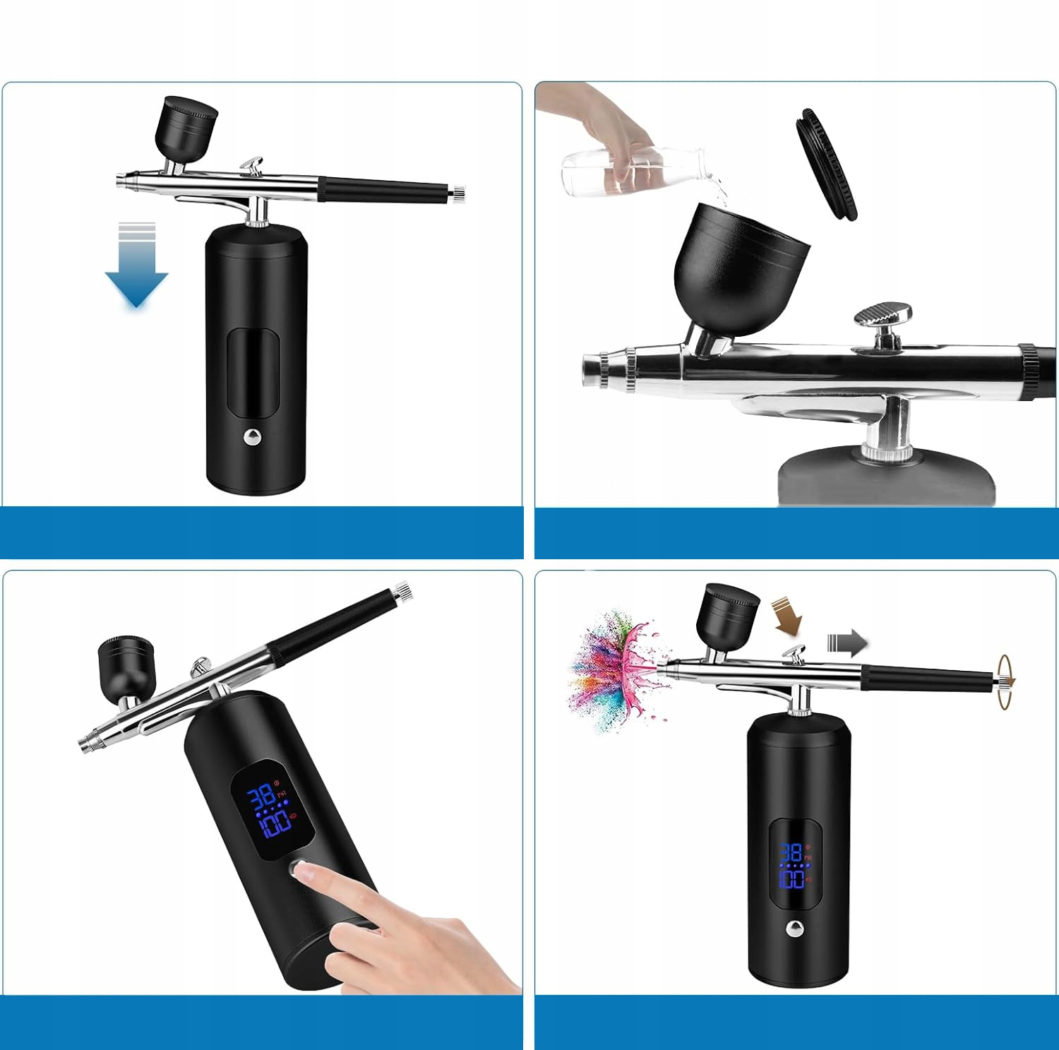 🎨 🎨🎨【 Міні -набори аерографа】 Набір повітря -компресора -це зручний інструмент, придатний для різних програм. Завдяки його невеликому розмірі його можна легко переміщувати в будь -яке місце. Порівняно з аналогічною аерографом, доступною на ринку, тиск повітря збільшується на 50%, тиск повітря становить 22-38 фунт / кв.дюйм, а потік повітря досягає 6-8 літрів. У нашому нещодавно вдосконаленому пістолеті з розпиленням є 3 рівні регульованого тиску повітря, а наш бездротовий набір пістолетів для розпилення ідеально підходить для прикраси тортів, нанесення макіяжу або малювання автомобілів.