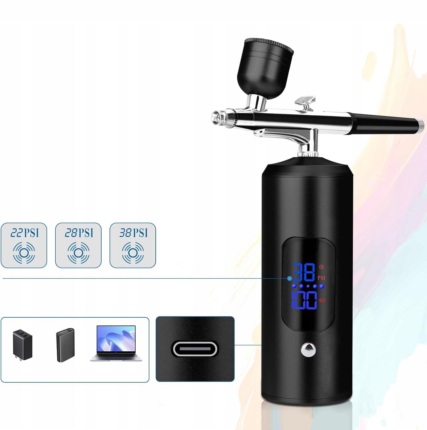 🖍 【【0,3 мм рідка насадка】 Цей пістолет з розпиленням із насадкою 0,3 мм дозволяє більш точне управління потоком фарби і менше бризок. Ви можете повернути ручку, щоб керувати кількістю спрею. Насадка видаляється. Важливо правильно розбавити фарбу, оскільки густа фарба може підключити аерограф. Після завершення процесу розпилення використовуйте щітку для очищення, щоб швидко та ретельно очистити камеру душового пістолета, насадку та рідку контейнер. 4 Після повного заряду робочий час становить 30-40 хвилин. Перед використанням переконайтеся, що він повністю заряджений. Після повного заряду акумулятор може працювати постійно до 1 години. Портативний пістолет з розпилення підтримує зарядку USB та Power Bank, тому ви можете використовувати розпилювальний пістолет у будь -який час і час. Щоб отримати найкращі результати та захистити зброю, рекомендуємо не використовувати її під час зарядки.