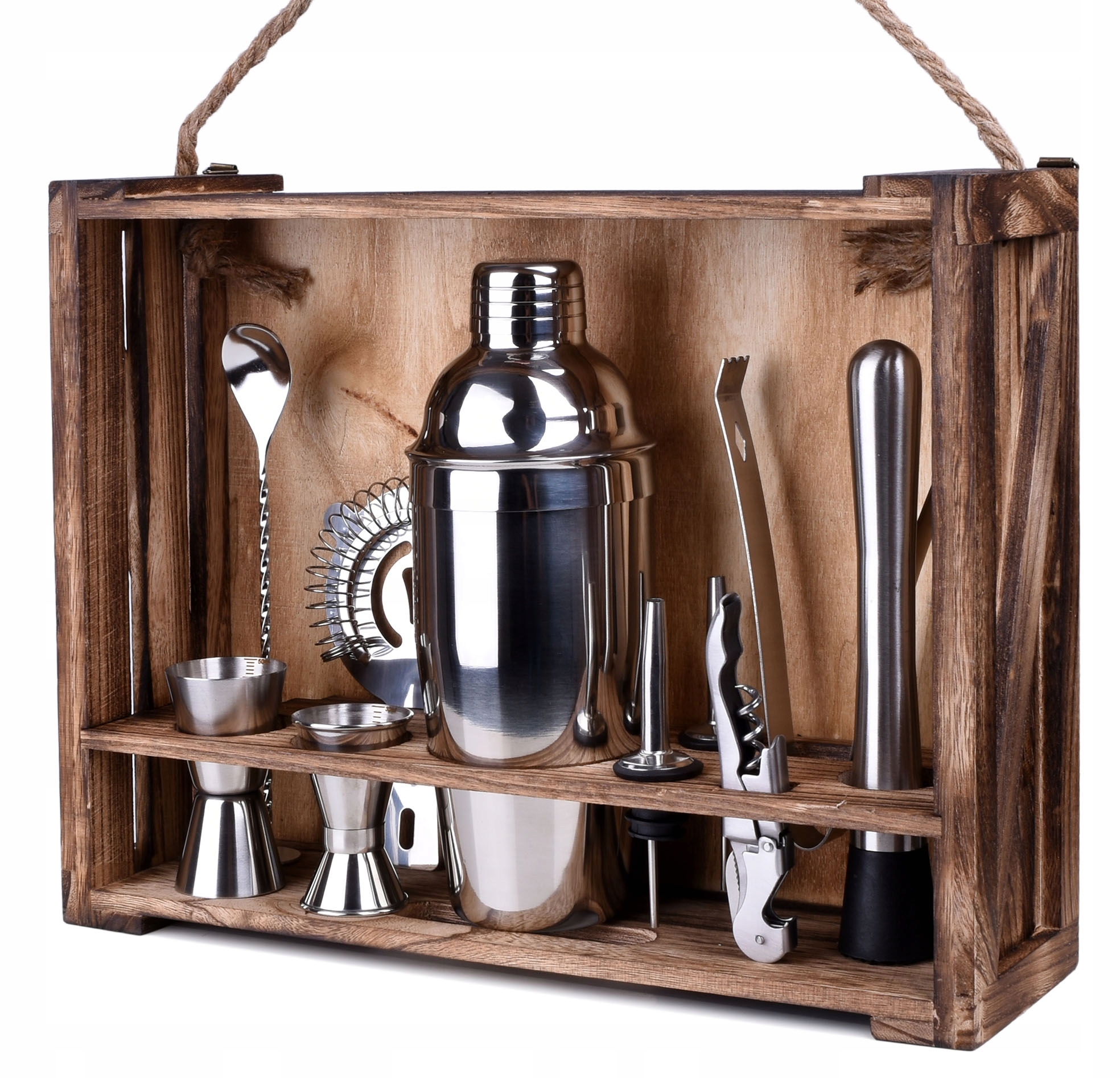 Ви робите вечірку і хочете здивувати своїх гостей? Набір барменів допоможе вам розпочати подію та підготувати оригінальні, цікаві напої. Кожен елемент набору виготовлений з найвищої якості нержавіючої сталі , завдяки якому не змінює смак напоїв . У наборі аж 11 елементів: 10 аксесуарів з нержавіючої сталі та вистрілена дерев’яна підставка.