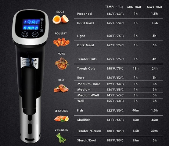 Кулінарний термостат Sous vide відповідає за циркуляцію води в посудині та забезпечує рівномірну температуру в будь-якому місці каструлі. Пристрій використовується в технології приготування страв у вакуумних пакетах. Кухонний термостат і вакуумна пакувальна машина дозволяють приготувати