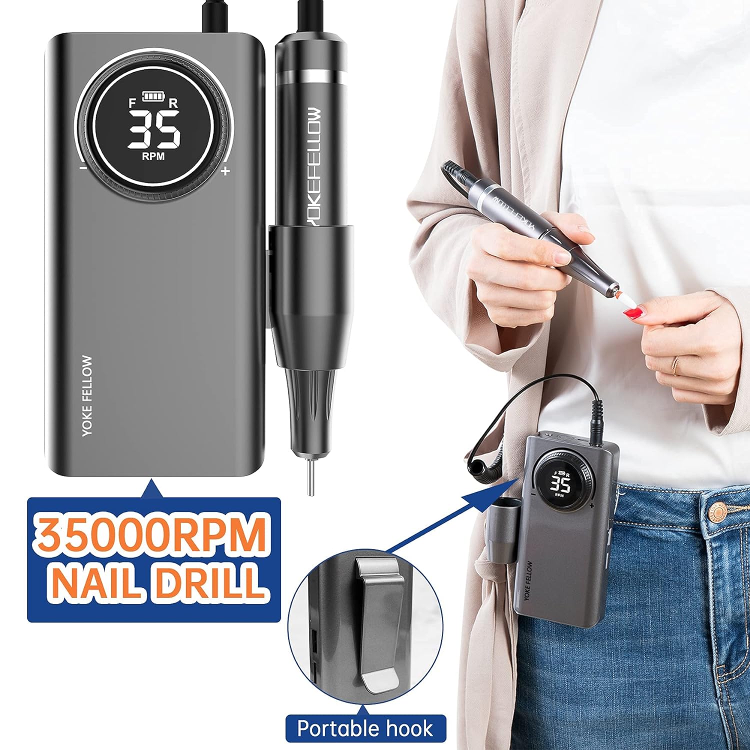 - [Портативний і легкий дизайн]:Високоякісна дриль для нігтів довговічна ручка з алюмінієвого сплаву. На задній частині машини є гачок, який можна повісити в кишеню або сумку. Він також має два тримачі для ручок з обох боків, що полегшує роботу в різних положеннях. Він легкий, тому його зручно носити.
