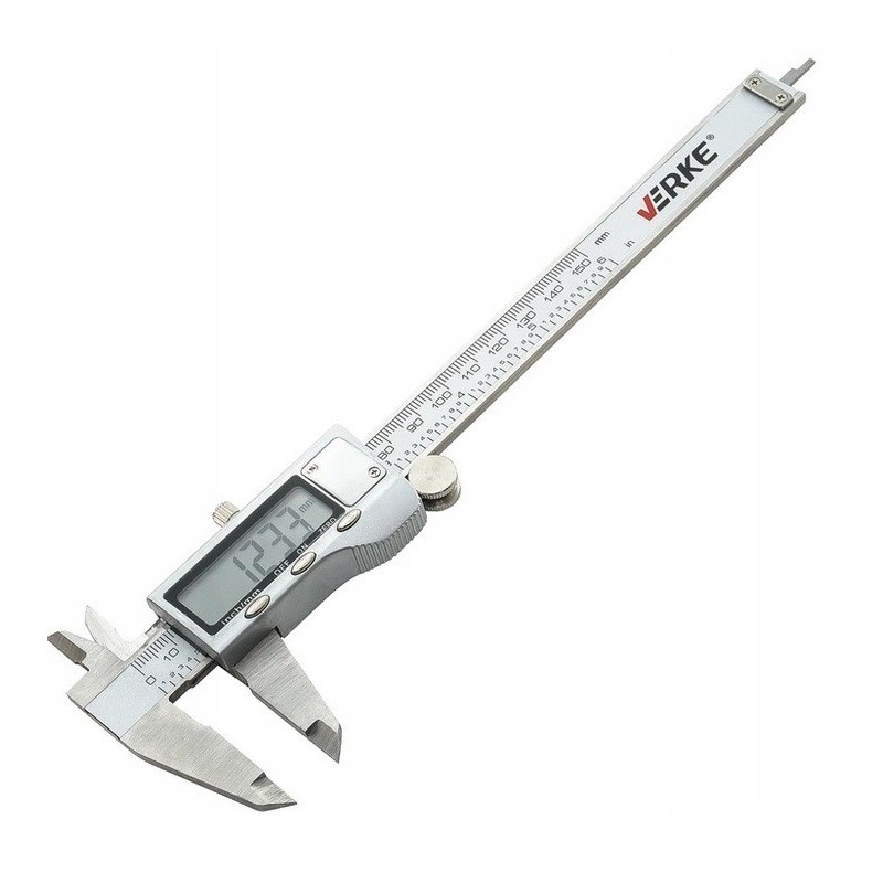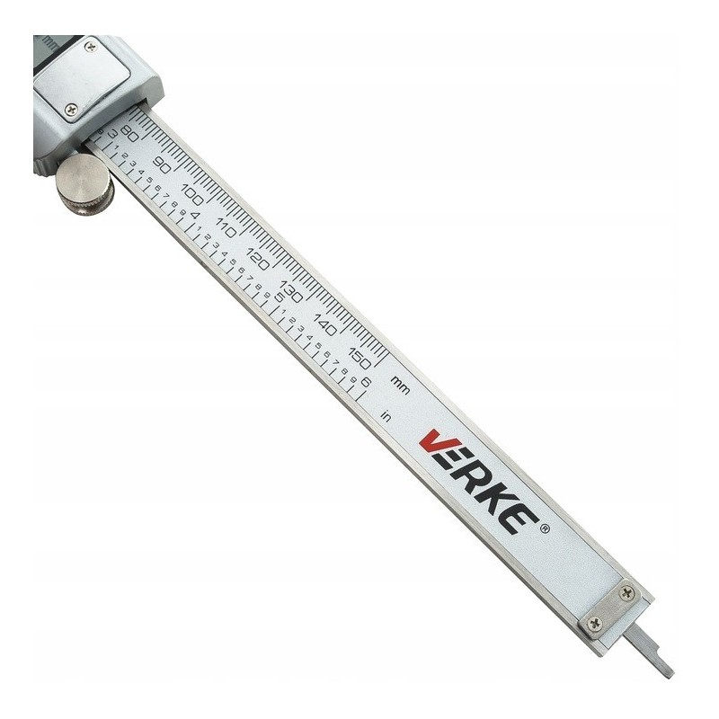 Електронний штангенциркуль Verke з діапазоном вимірювання від 0 до 150 мм і точністю (+/-) 0,02 мм/0,001". Він виготовлений з нержавіючої сталі та оснащений РК-дисплеєм на рідких кристалах із роздільною здатністю 0,01 мм/0,005 дюйма. Перемикач на дисплеї дозволяє виконувати вимірювання в метричних і дюймових системах. Все це поміщений у міцну та зручну упаковку Штангенциркуль призначений для вимірювання зовнішніх і внутрішніх поверхонь і глибини.