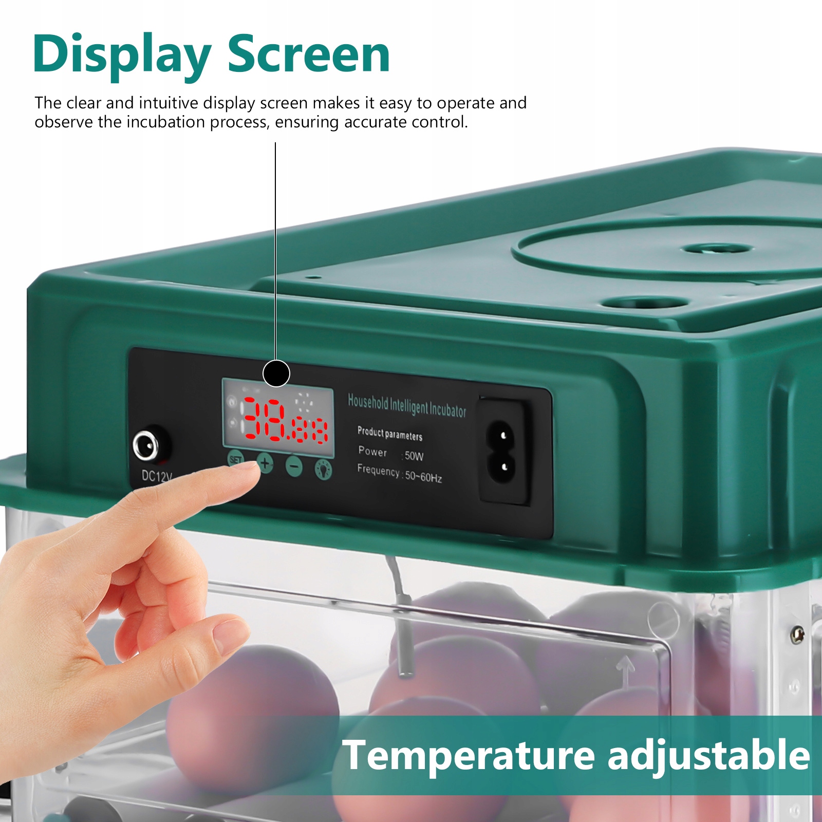 Інкубатор для яєць є повністю автоматичним, з контролем температури, автоматичним перевертанням яєць і наповненням водою, що робить його простим у використанні.