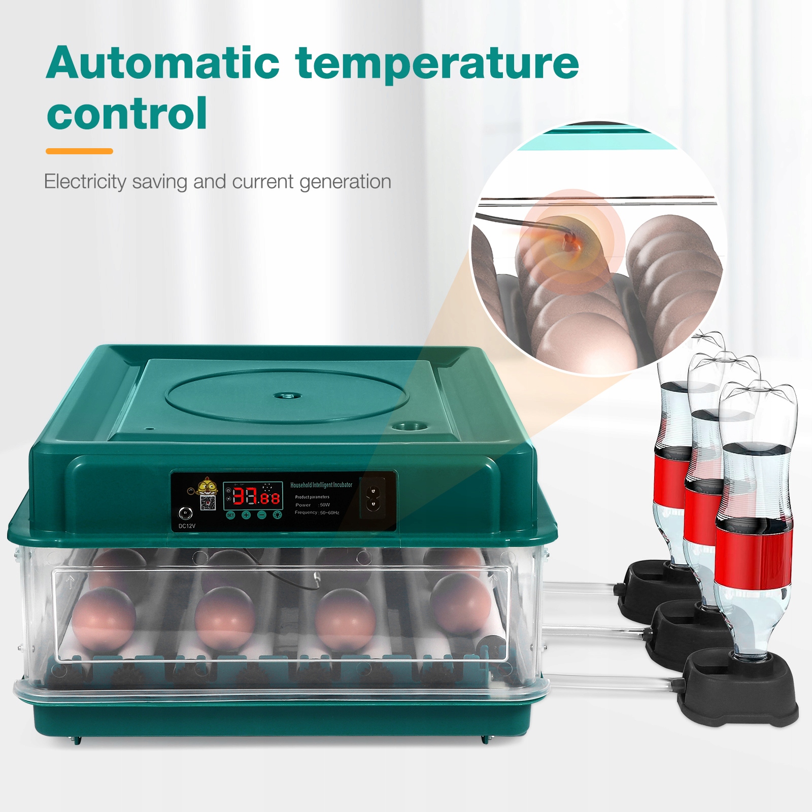 Інкубатор для яєць є повністю автоматичним, з контролем температури, автоматичним перевертанням яєць і наповненням водою, що робить його простим у використанні.