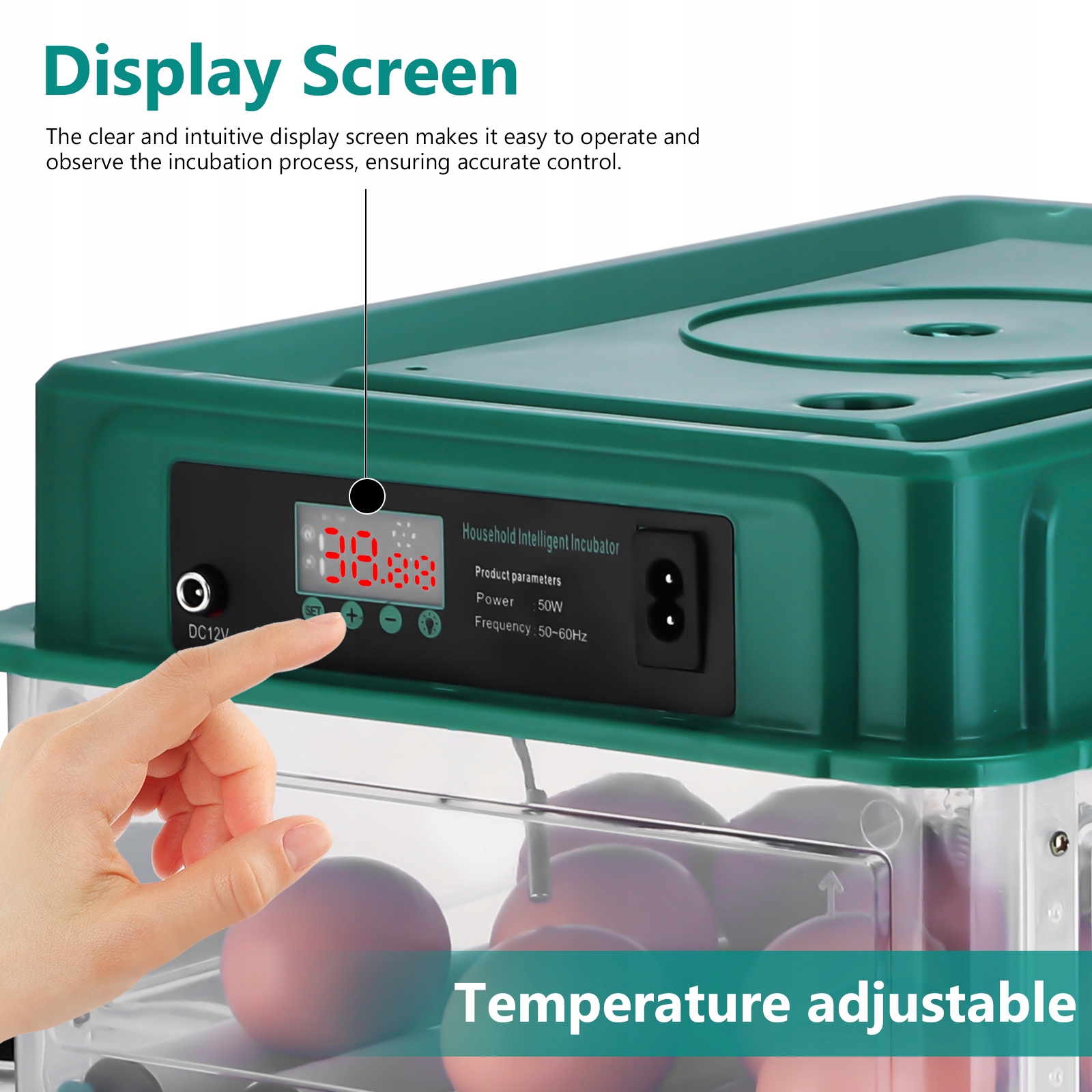 Вбудований чіткий дисплей полегшити програмування температури. Постійно відображає поточну температуру та вологість всередині інкубатора