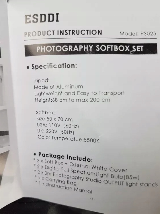✳️Студійний комплект ESDDI PS025 є ідеальним рішенням для фотографів і відеотворців, які хочуть досягти професійних результатів. У набір входять два софтбокси потужністю 85 Вт кожен, що забезпечують рівномірне та природне освітлення з температурою 5500K.