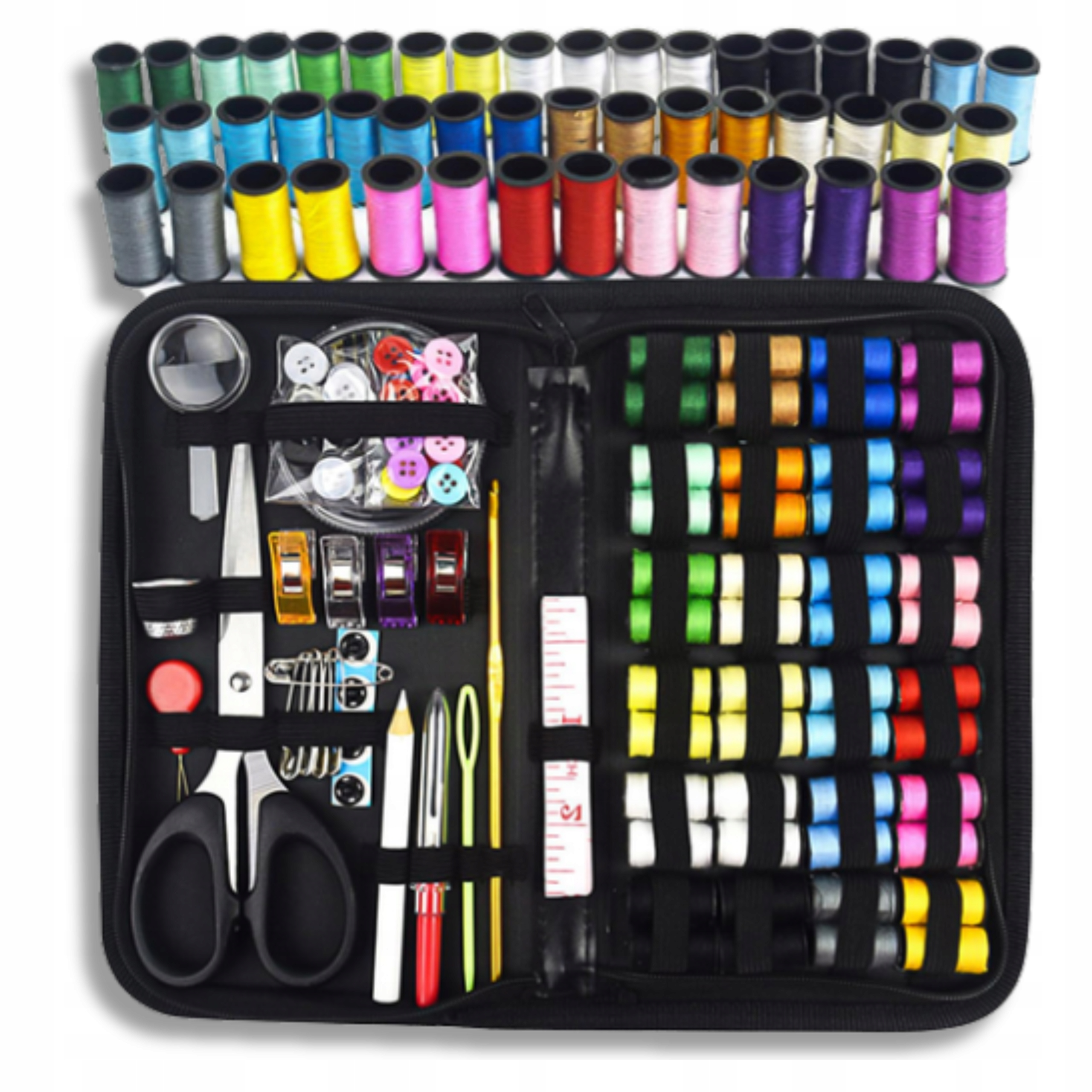 Цей кравець з 226 Елементів містить усе, що потрібно для шиття, ремонту та персоналізації. Ретельно замовлений у практичному випадку, він забезпечує простий доступ до інструментів і дозволяє підтримувати порядок.