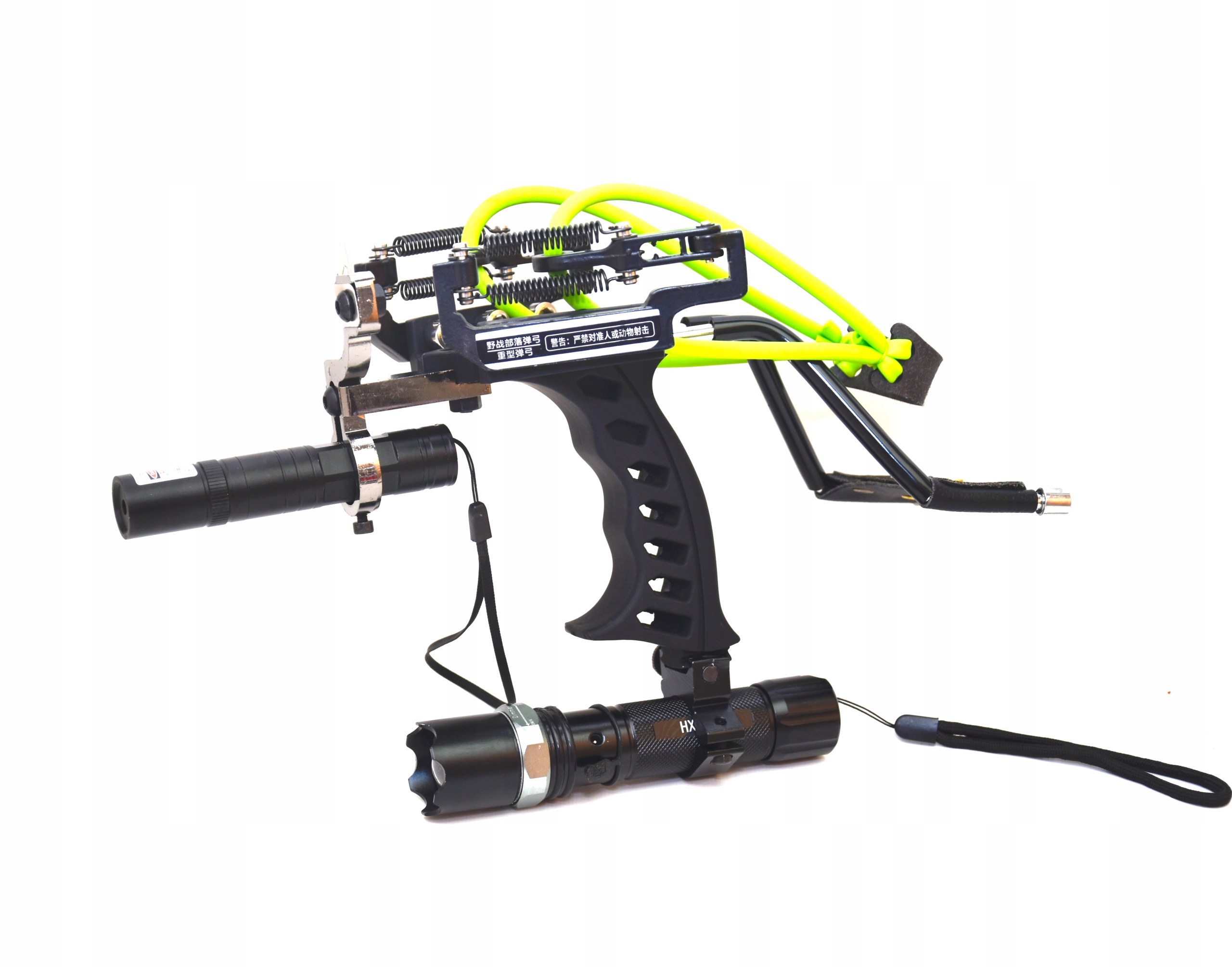 - Лазерний приціл у вигляді прикріпленого зеленого лазера в передній частині рогатки потужністю 500 мВт полегшить націлювання на вибрану ціль.