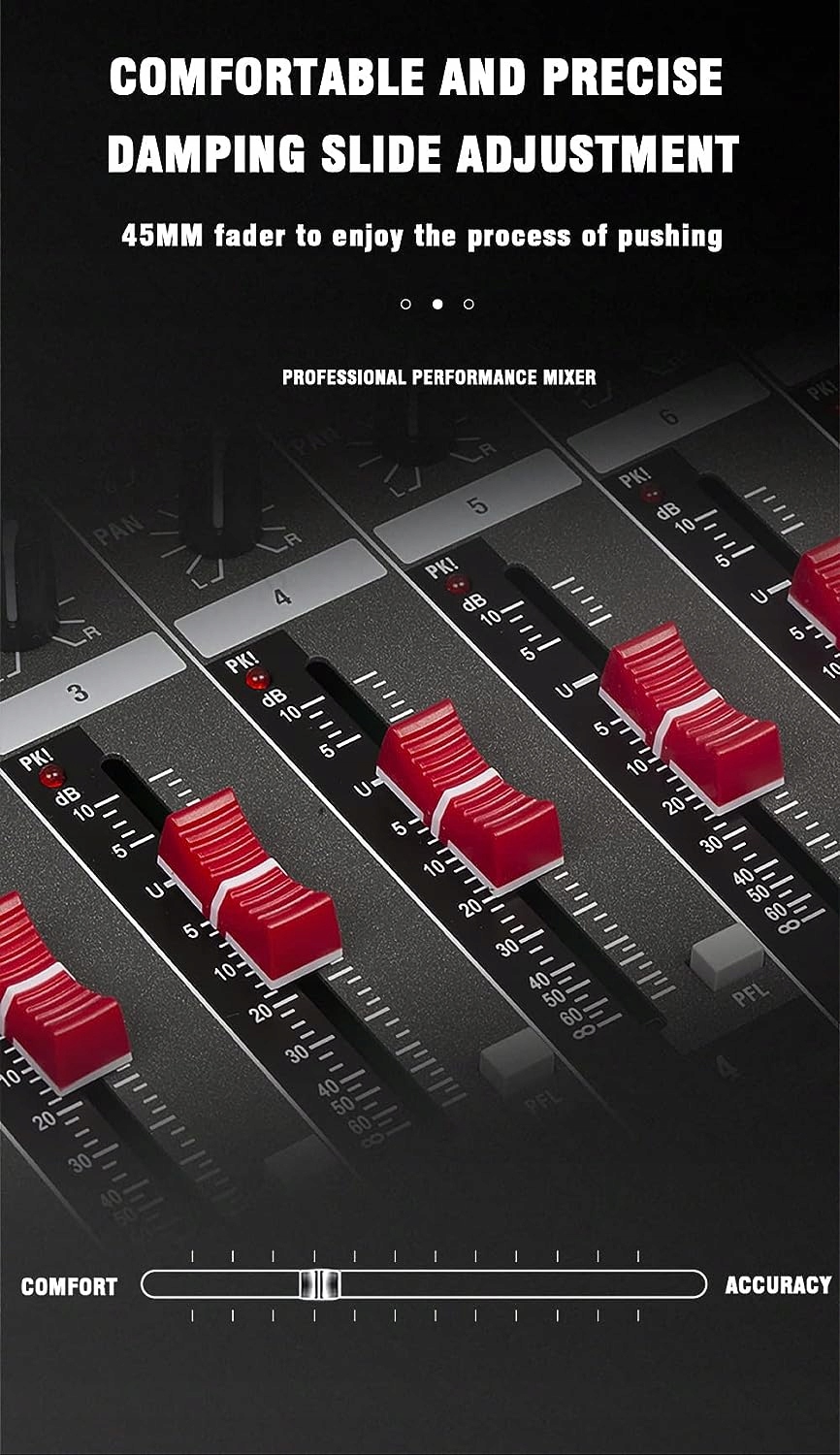 16-канальний музичний мікшер, низький рівень шуму, високоточний попередній підсилювач. Ультратонкий і міцний корпус аудіомікшера: лише 1,5-дюймовий ультратонкий дизайн. DJ MP3/USB вхід, вбудоване бездротове підключення Bluetooth, сумісний з USB, флеш-рідер, MP3. Підключіть зовнішній USB-пристрій, ПК, флешку або пристрій Bluetooth для мікшування та запису; використовуйте вбудовані елементи керування для відтворення/паузи, пропуску треків і перемикання між режимами. Мікшер сумісний з різними пристроями, такими як мікрофон/інструмент, що робить його придатним для домашнього КТВ, виступів гуртів, заходів у кампусі, конференцій та інших випадків. Підтримує підключення дротових/бездротових/конденсаторних мікрофонів і музичних інструментів. Повністю металевий корпус, закриті поворотні ручки для захисту від пилу та бруду. Компактний діджейський мікшер забезпечить повний динамічний контроль для чудової чіткості звуку, дозволяючи вам досягти найвищої якості, кристально чистого відтворення музики на студійному рівні. Забезпечує фантомне живлення 48 В - підключається до ноутбуків, комп'ютерів, аудіообладнання - працює як з Mac, так і з ПК, підтримує студійні конденсаторні мікрофони.