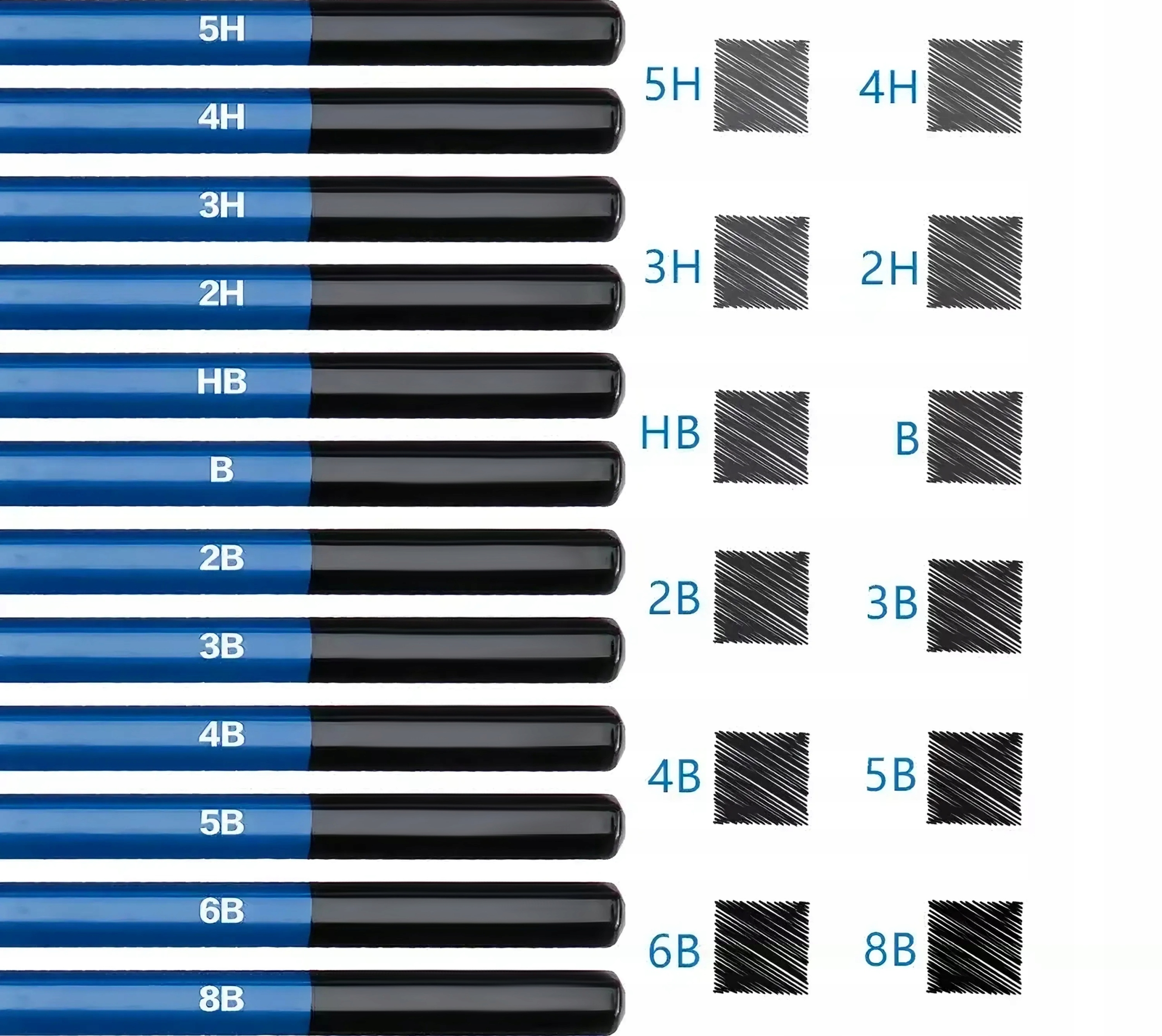 ✔️ У наборі 12 видів олівців. Їх твердість можна розпізнати за символами 2H / 3H / 4H / 5H / HB / B / 2B / 3B / 4B / 5B / 6B / 8B.