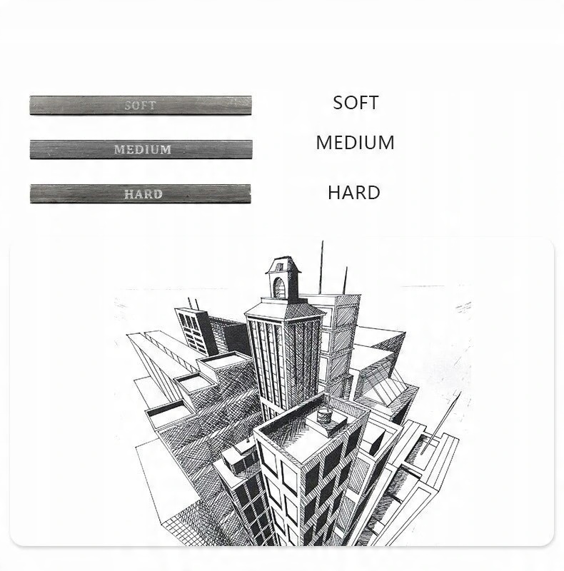 ✅ Карбон доступний у 3 твердостях. Це дозволяє отримати гладкі, рівні та інтенсивні чорні лінії. У набір також входять вугільні олівці для художників, які люблять малювати вугіллям, але цінують чистоту своєї роботи.