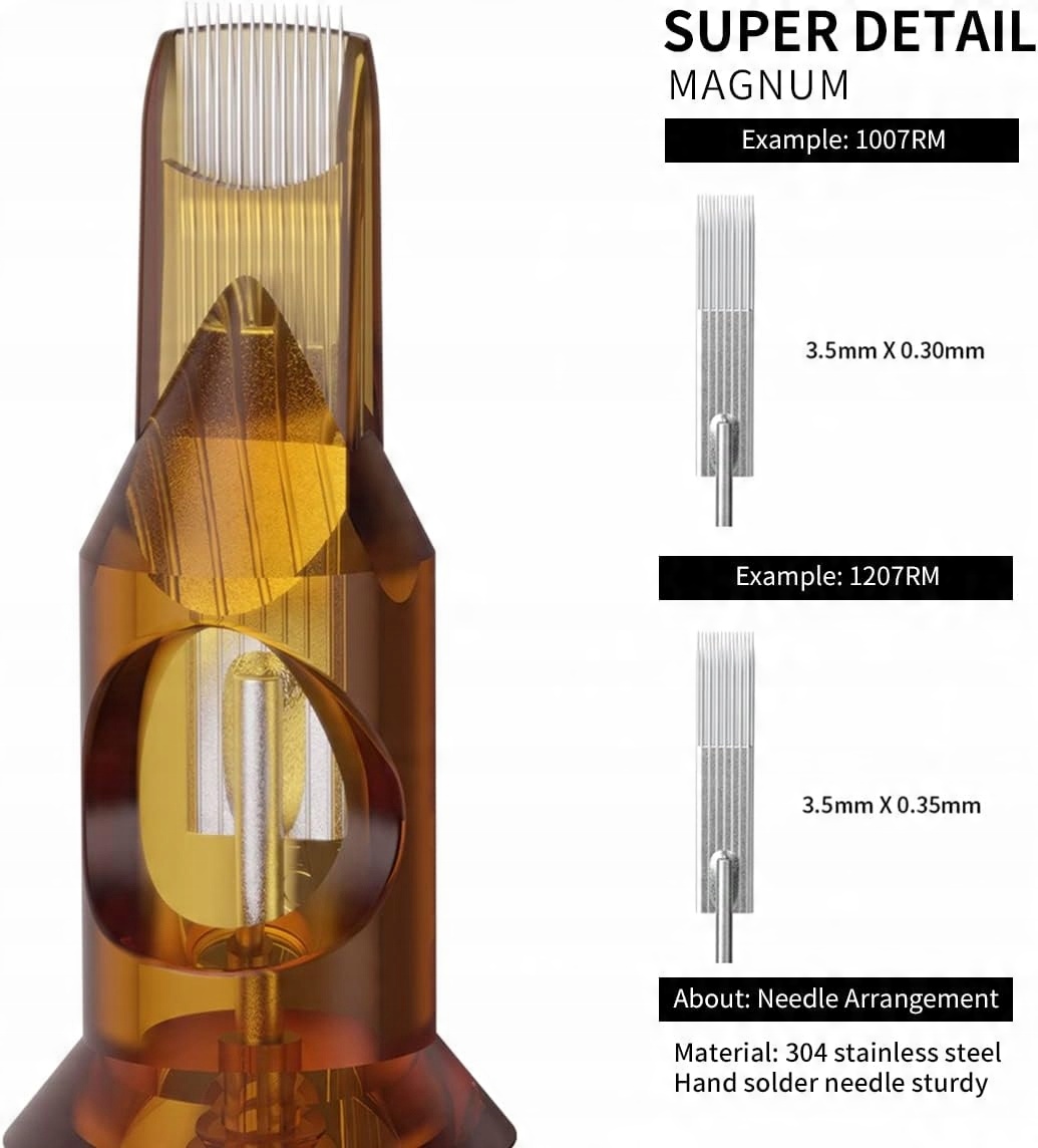 Мембранна система – мембранна система голки може підтримувати постійну кількість рідини з кожним підйомом. Чорнило для татуювань не тече назад у трубку завдяки чорнильному картриджу та пластиковій плівці в гумці. Легке заправлення чорнилом - вставте голки в невеликий контейнер або залийте чорнило у верхній отвір картриджа, кращий потік чорнила та формований всередині. Він має загнутий кінчик на кінці для полегшення проходження поворотів. Широкий діапазон сумісності – сумісний з усіма роторними/спіральними/Harsso машинами та тримачами. Набір голок для татуювання поставляється в коробці по 20 голок (1005RL). Очищений кінчик голки з нержавіючої сталі медичного класу 316. Голки Harsso Tattoo виготовлені з нержавіючої сталі 316, за винятком того, що наконечник зроблений з медичного пластику. 100% стерилізований газом EO та індивідуально упакований.