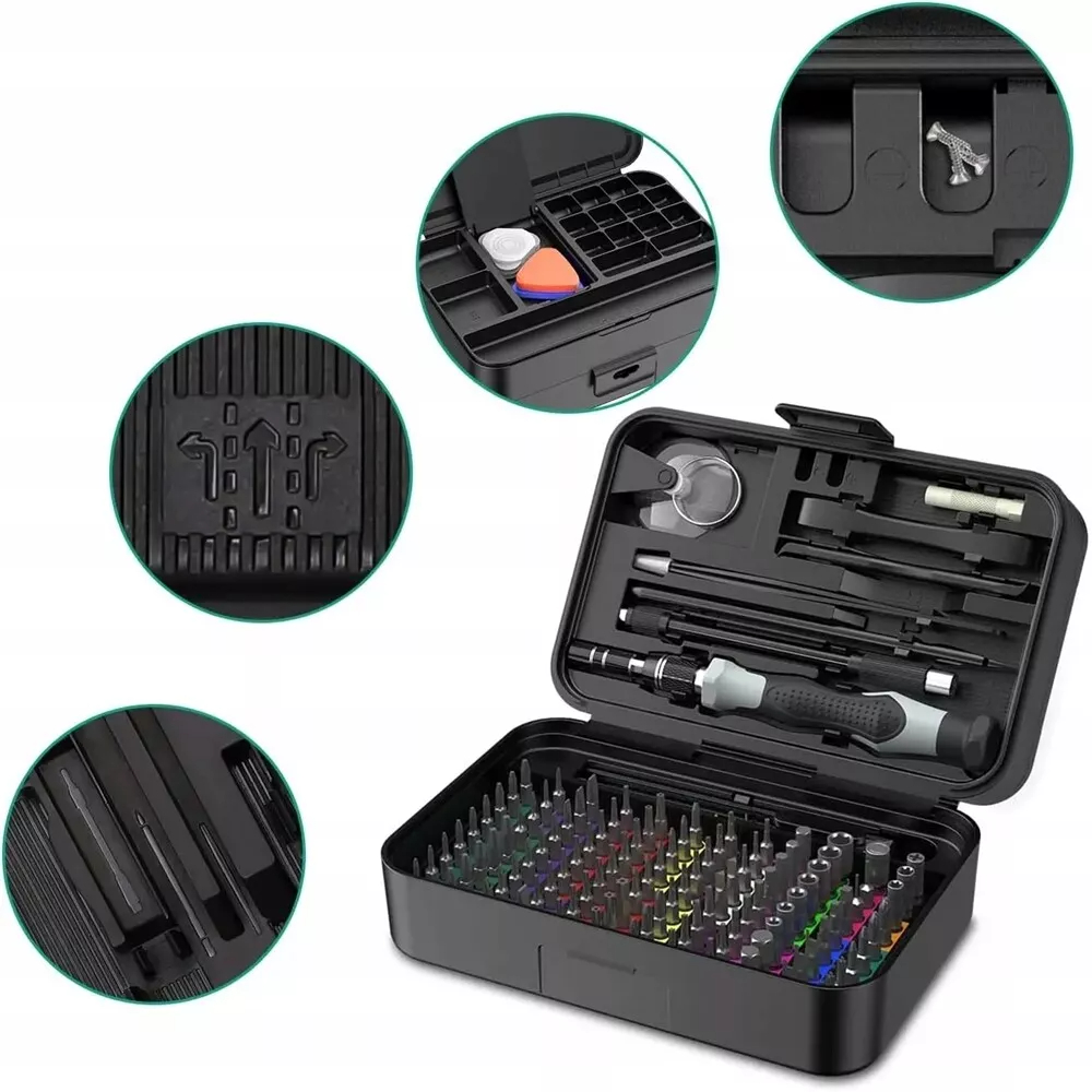 【Велика коробка для зберігання вгорі】Цей набір мікропрецизійних інструментів для ремонту 132 в 1 постачається з великою коробкою для зберігання деталей угорі. Є 18 сітчастих відділень 5 різних розмірів для зберігання та впорядкування дрібних предметів, таких як гвинти та електронні аксесуари. У порівнянні з магнітними килимками, контейнер, що входить до цього невеликого набору прецизійних викруток, більш зручний. За потреби ви можете закрити кришку та перемістити контейнер, не турбуючись про втрату дрібних предметів.