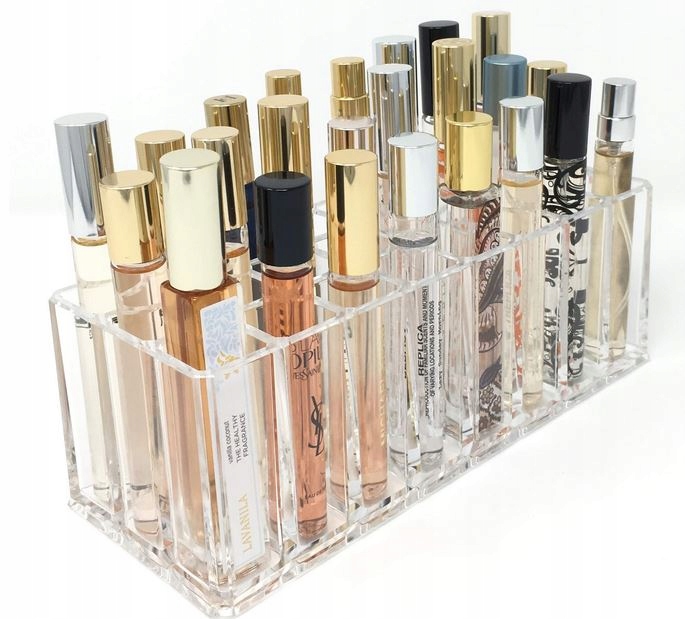 24 слоти для косметичних пензликів стандартного розміру, виготовлені з однієї форми без склеєних частин. Дизайн зі скошеними краями, які не залишають гострих країв. Виготовлений із чистого кристалічного акрилу, який імітує зовнішній вигляд скла.