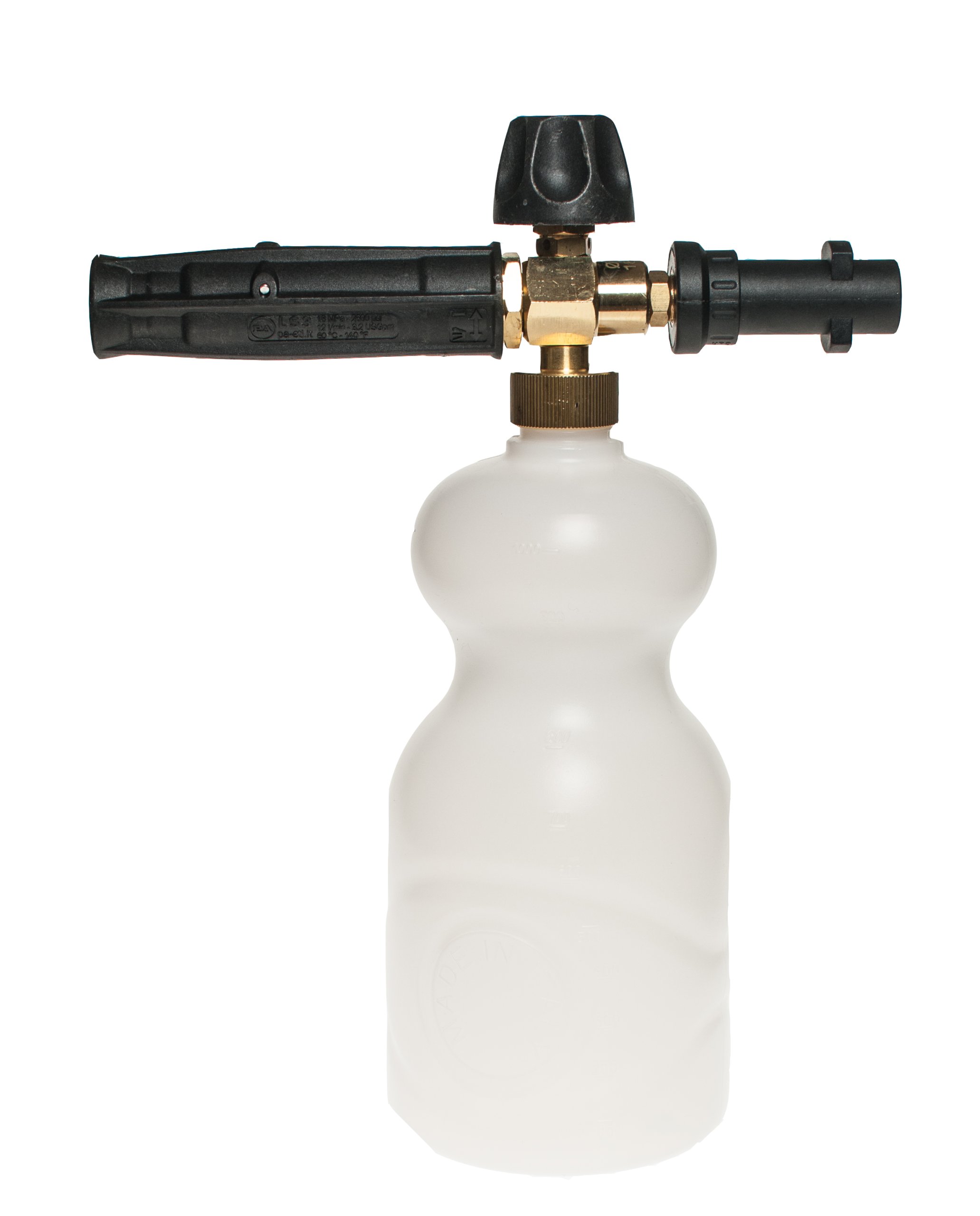 пінопласт добре відомої італійської компанії pa з 1 -ліком для очищення резервуара для кріплення безпосередньо на пістолет. Миючий засіб не транспортується насосом пристрою високого тиску - здатність використовувати сильні засоби для чищення. Прозорий бак з шкалою дозволяє контролювати кількість миючого засобу.
