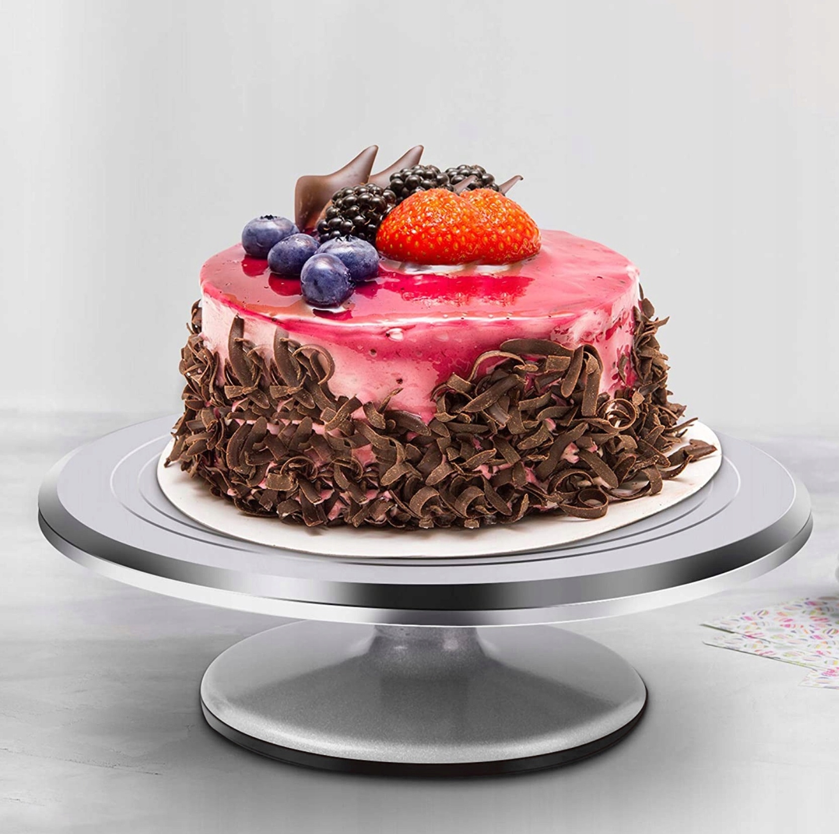 Професійний поворотний вершник для прикраси тортів та тортів та подачі солодощів. Завдяки своїй високій вазі літак є твердим і забезпечує вільне обертання після подання в русі. Основа