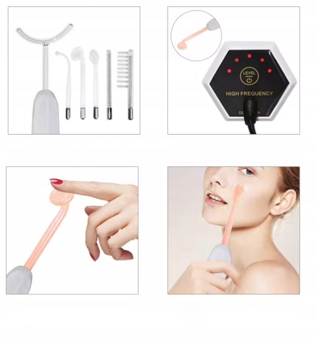 Апарат для високочастотної терапії – це портативний електричний пристрій, який використовується для антибактеріальної терапії та лікування жирної та вугрової шкіри. Апарат електротерапії має змінні скляні гранули з газом і змійовик всередині. Внутрішня котушка перетворює електричний струм в енергію, яка нагріває неон або аргон, що містяться в електроді. Коли електрод наближається до шкіри, утворюється тонкий стерильний озоновий шар. Цей догляд допомагає заспокоїти шкіру, знімає подразнення та запалення та допомагає в лікуванні акне та інших шкірних захворювань.