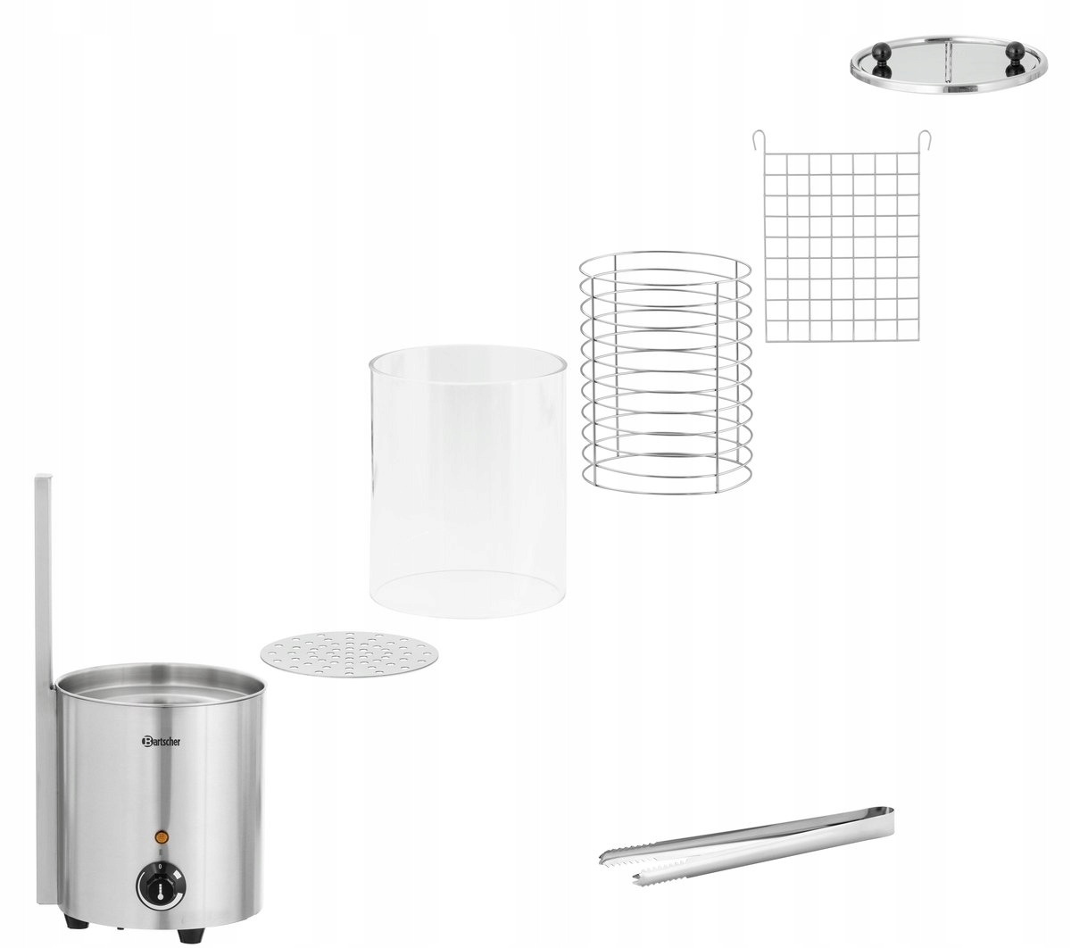 Професійний пристрій з гарячою собакою Bartscher A120427-це практичне рішення для барів, АЗС та пунктів харчування, які хочуть швидко обслуговувати теплі закуски. Скляний циліндр зі світлодіодним підсвічуванням не лише підтримує відповідну температуру франкфертерів, але й естетично їх викриває, привертаючи увагу клієнтів.