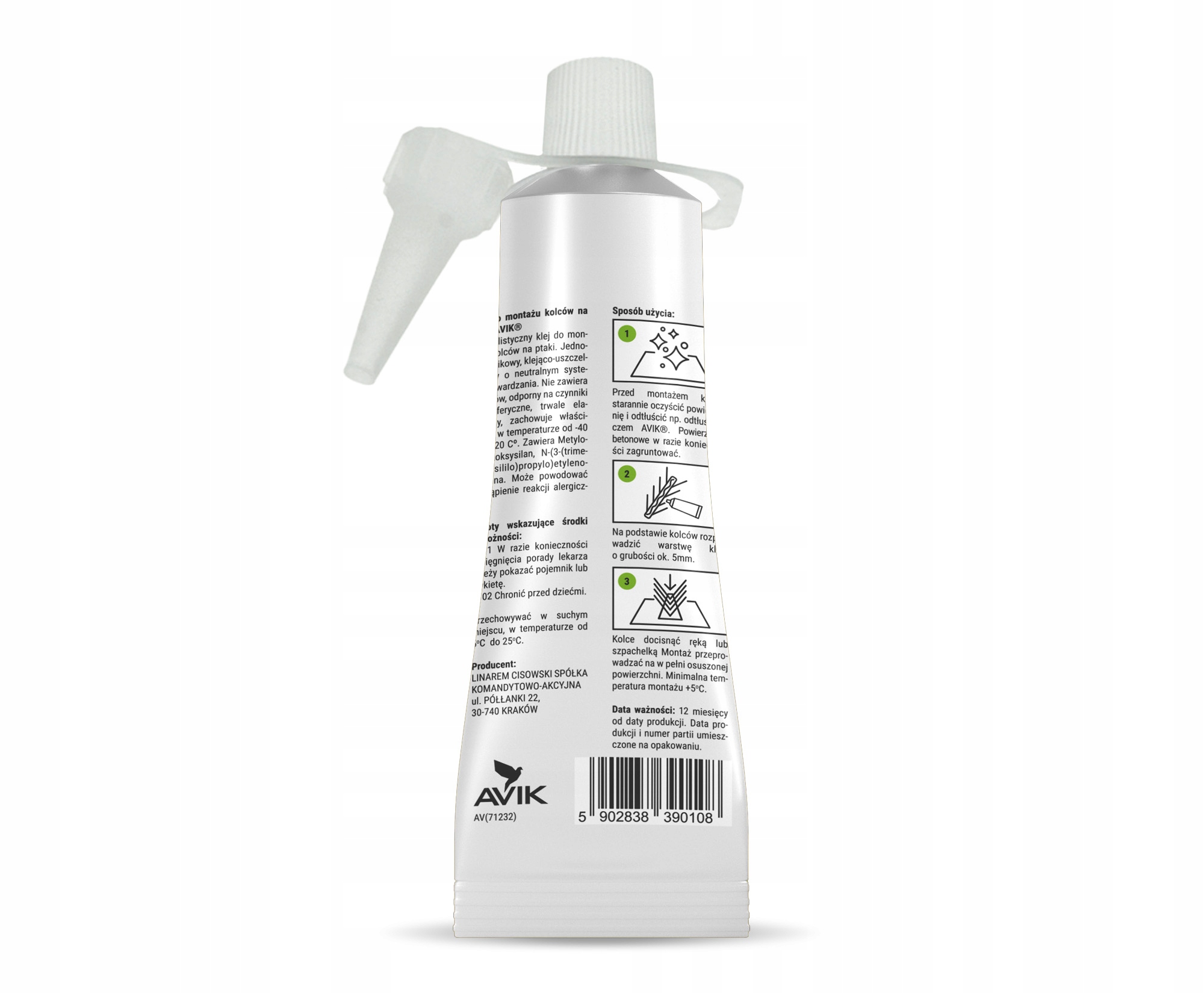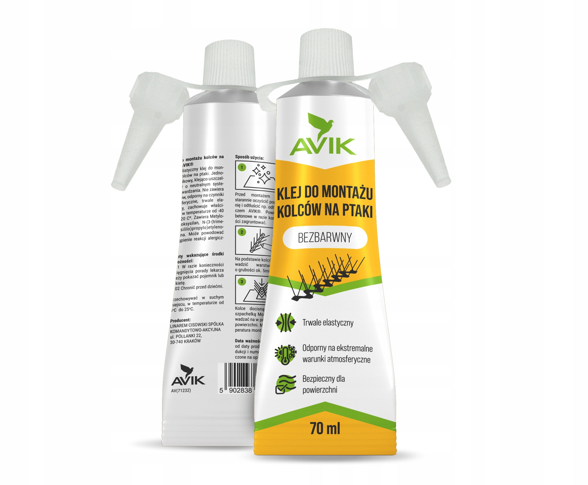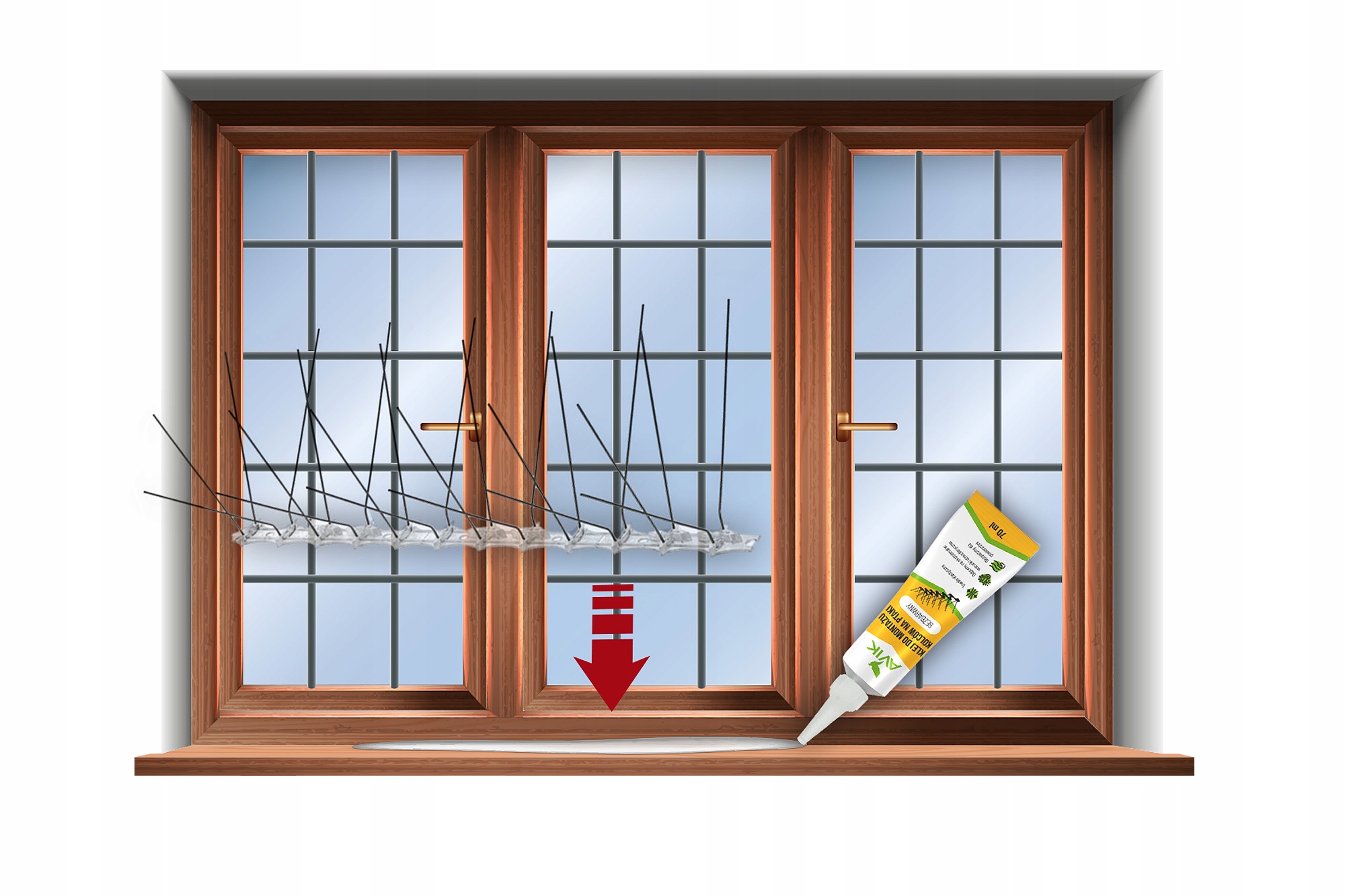 Тюбик зі зручним аплікатором, 70 мл. Клей для кріплення шипів дозволяє встановити приблизно 3-4 м. шипи для птахів.