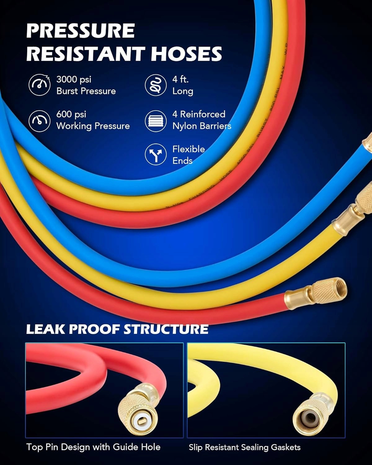 🔹 Кольорові шланги (3 шт.) - для низьких (синій), високих (червоний) і сервісних (жовтий) з'єднань.