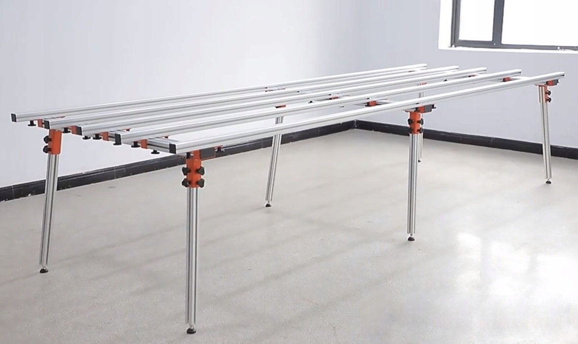 - Модульна балкова система: Поперечні алюмінієві профілі можна переміщати та розташовувати в будь-якій конфігурації. Завдяки цьому ви можете ідеально відрегулювати опору для вирізання отвору або лінії, уникаючи пошкодження столу відрізним диском.