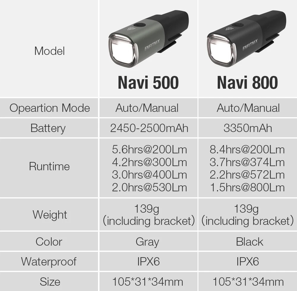 Легкий, маленький, технологічний передній світлодіодний ліхтар для велосипеда відомої компанії Enfitnix, модель Navi500, виготовлений з алюмінію за технологією CNC, максимальна потужність 500lm, два режими роботи (ручний та автоматичний), датчик руху , індикатор низького заряду батареї, водо- та водонепроникність IPX6, зарядка через гніздо USB-C, змінна батарея з реальною ємністю 2500mAh, система відсікання світлового променя Cut-Line, щоб уникнути шкоди пішоходам, кут променя 170*, кріплення на кермі та під ним, вага 110 г, до 15 годин на одному заряді (в режимі спалаху, в інших режимах інший час видно в таблиці)