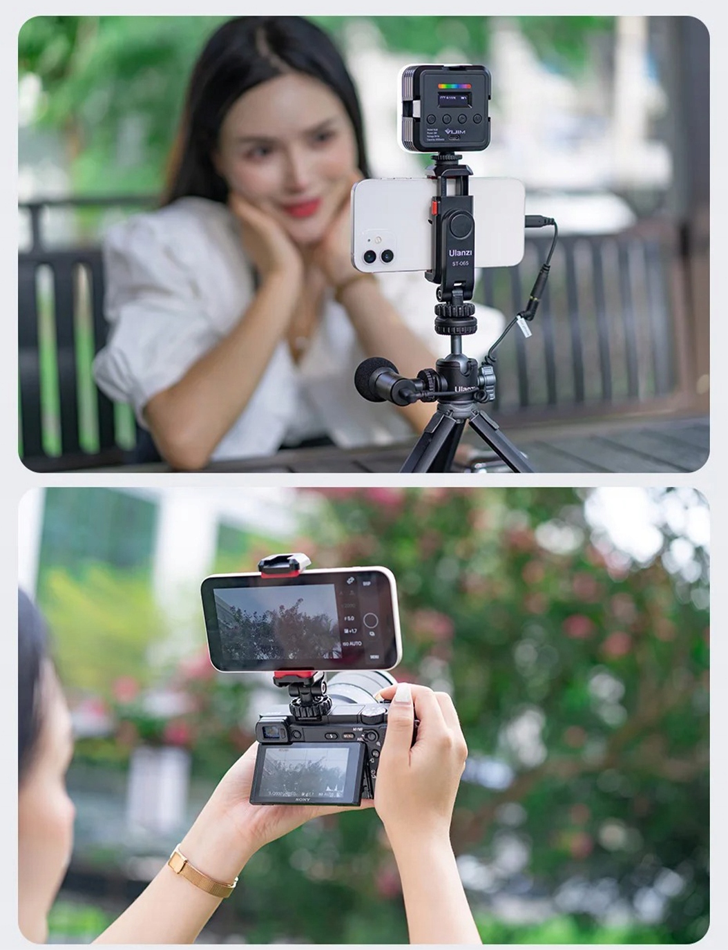 ST-06S — цеуніверсальний тримач для телефону, призначений для кріплення на штативі, оснащений холодним башмаком ( холодний черевик), який дозволяє легко прикріпити такі аксесуари, як мікрофон, світлодіодний ліхтар чи інші фотоінструменти. Сумісний із більшістю смартфонів, включаючи iPhone 16, цей тримач є важливим інструментом для відеоблогерів, фотографів та творці вмісту.