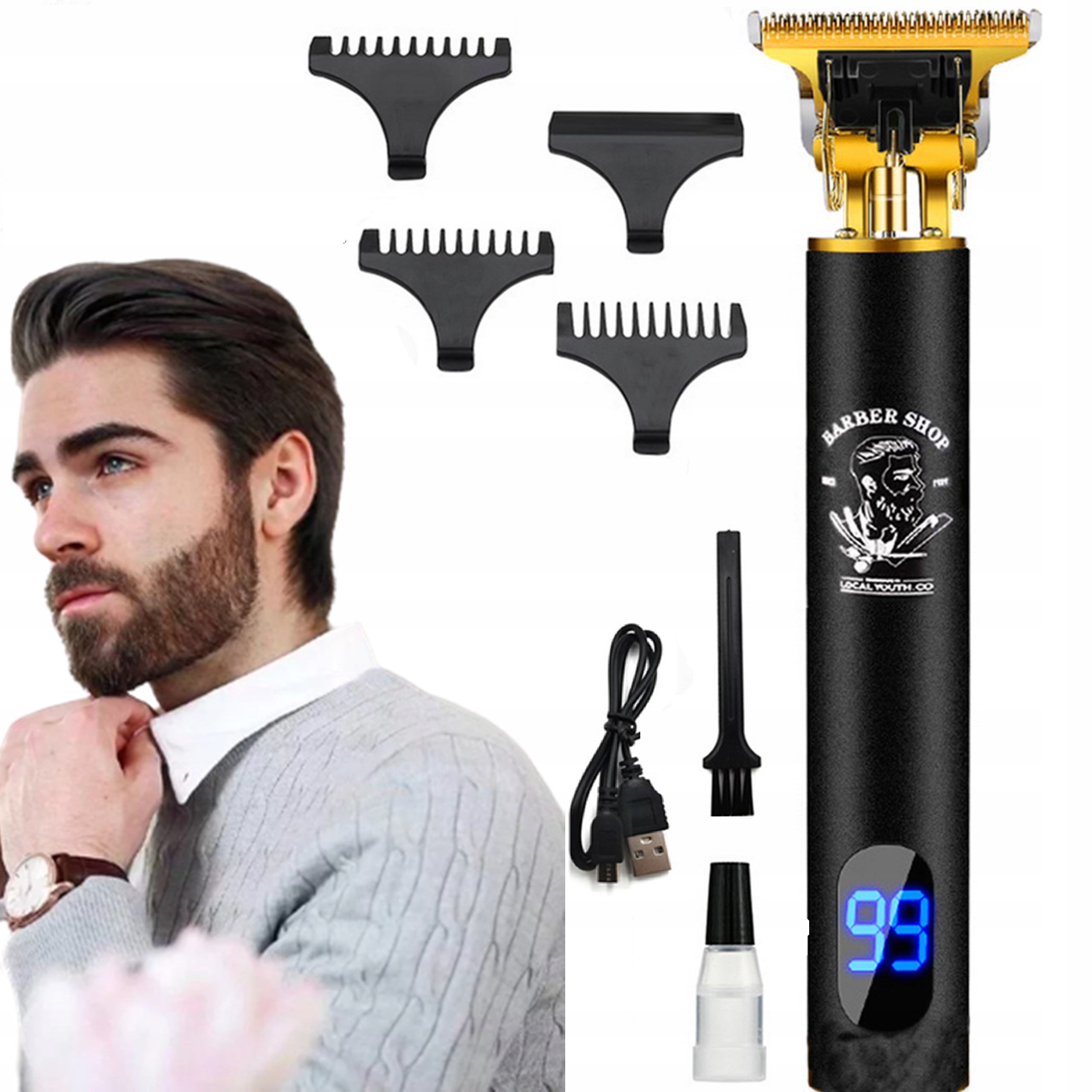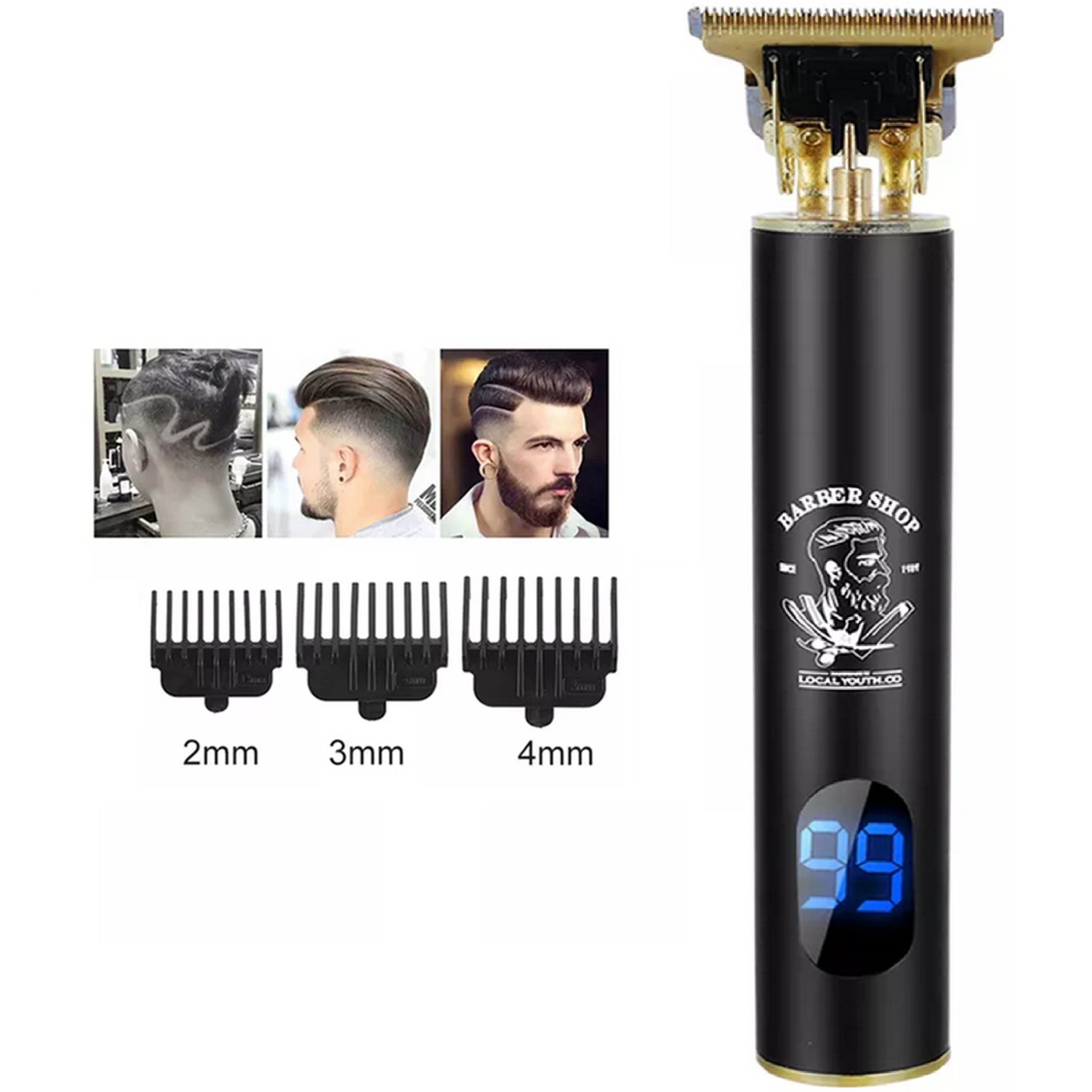 Електричний перукарський тример для чоловіків з повним обладнанням, необхідним для професійної стрижки та моделювання волосся та бороди. Бритву можна використовувати як бритву або тример. Сталеве лезо забезпечує точність, що забезпечує якість стрижки, як у перукаря чи перукаря.