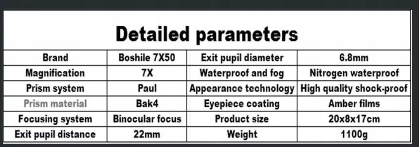 HD 7x50 водонепроникний бінокль, призначений для задоволення військових стандартів. Його можна використовувати в будь -яких погодних умовах, навіть під час екстремальних дощів або високої вологості. Завдяки цьому, це забезпечить вам усі інструменти, необхідні для наступних заходів на свіжому повітрі, таких як вітрильний спорт, спостереження за птахами, полювання, спостереження за спортивними матчами, подорожей у диких районах та багатьох інших. Специфікація: