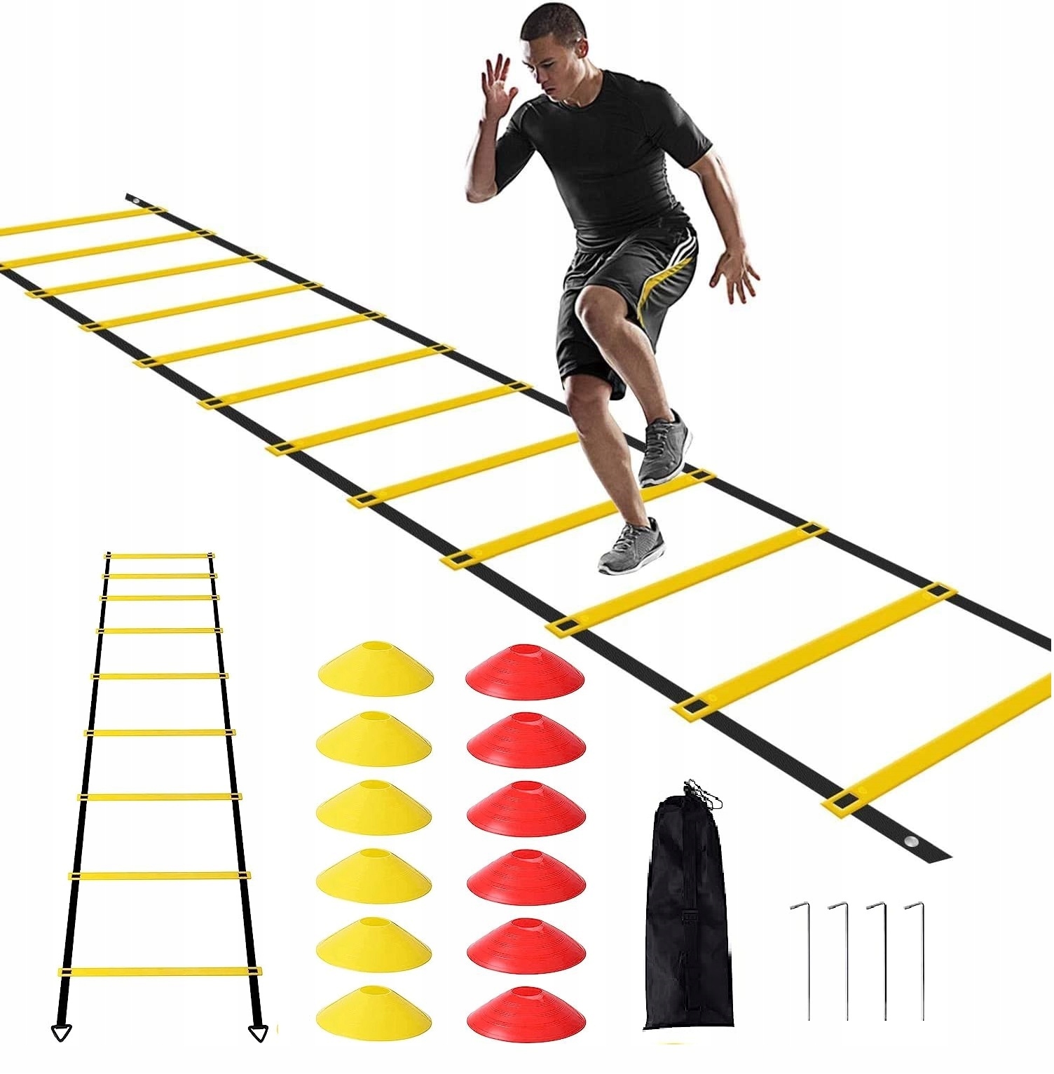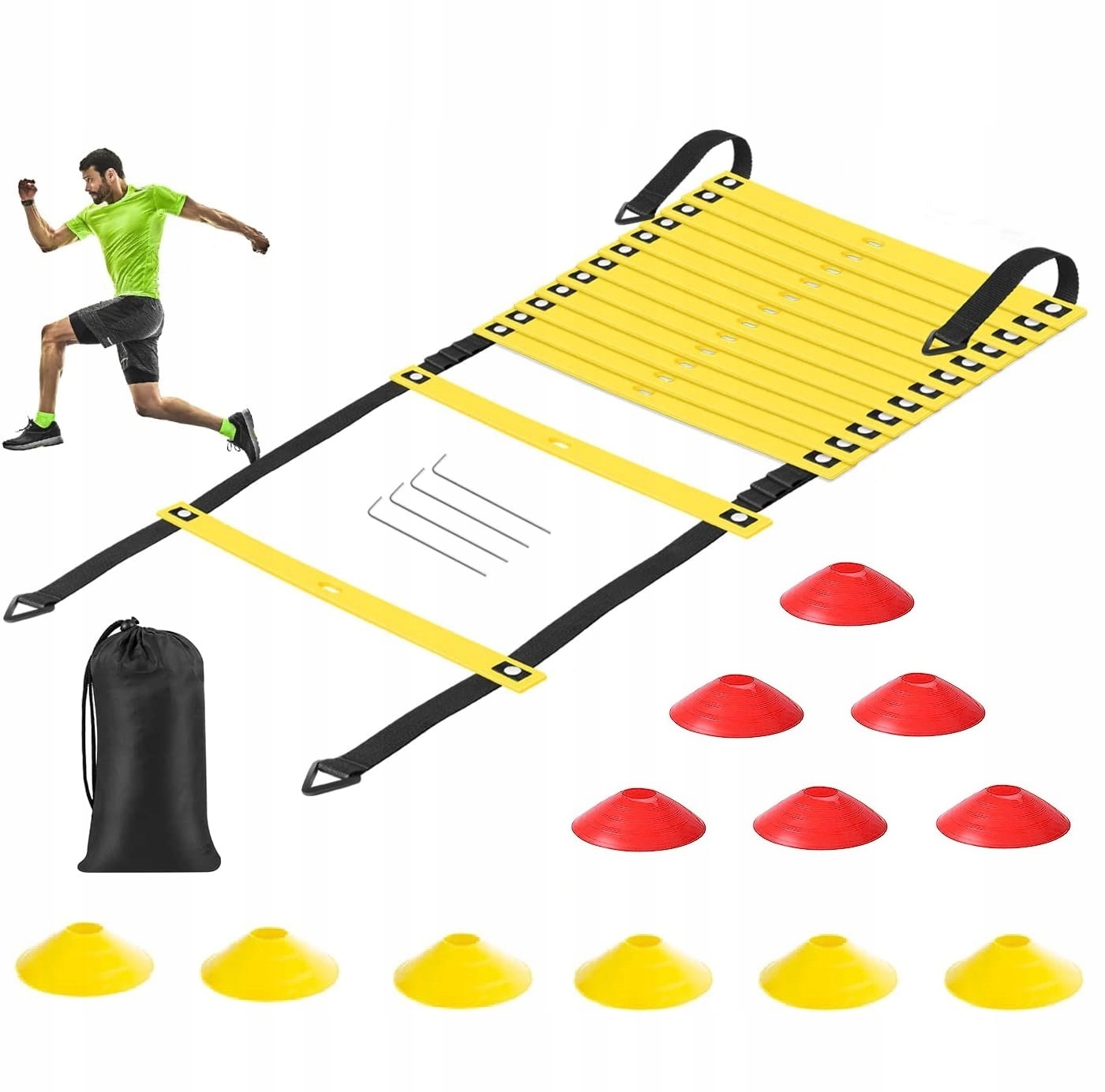 - - ✔️【Набір аксесуарів для футбольних тренувань】: у цьому профілі спритності є все, що вам потрібно, щоб підтягнутися. Кожен набір включає реверсивну драбину з 12 щаблями, 12 футбольних конусів, 4 сталеві стійки для додаткової стійкості та сумку для перенесення. Користуватися цим набором просто – чергуйте конуси та сходинки якнайшвидше, щоб виконувати вправи без зусиль.