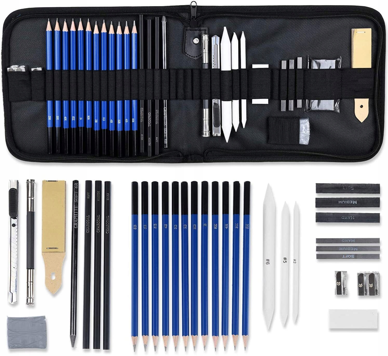 ⭐ У набір входять олівці різної твердості, олівець вугільний, олівець графітний, стіки графітні, стіки вугільні, блендери, ніж, подовжувач, гумки, точилки, блокнот абразиви.