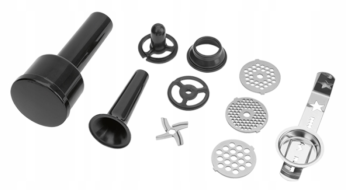 М'ясорубка оснащена якісною металевою камерою помелу і сітками. Машина легко перемелює м'ясо, мак або сухий хліб в сухарі. У набір входять насадки, за допомогою яких можна готувати домашні ковбаски, кульки для кеббе або ліпити печиво. Ідеально підходить для приготування домашніх різдвяних сирників, пиріжків з маком, спредів і паштетів.