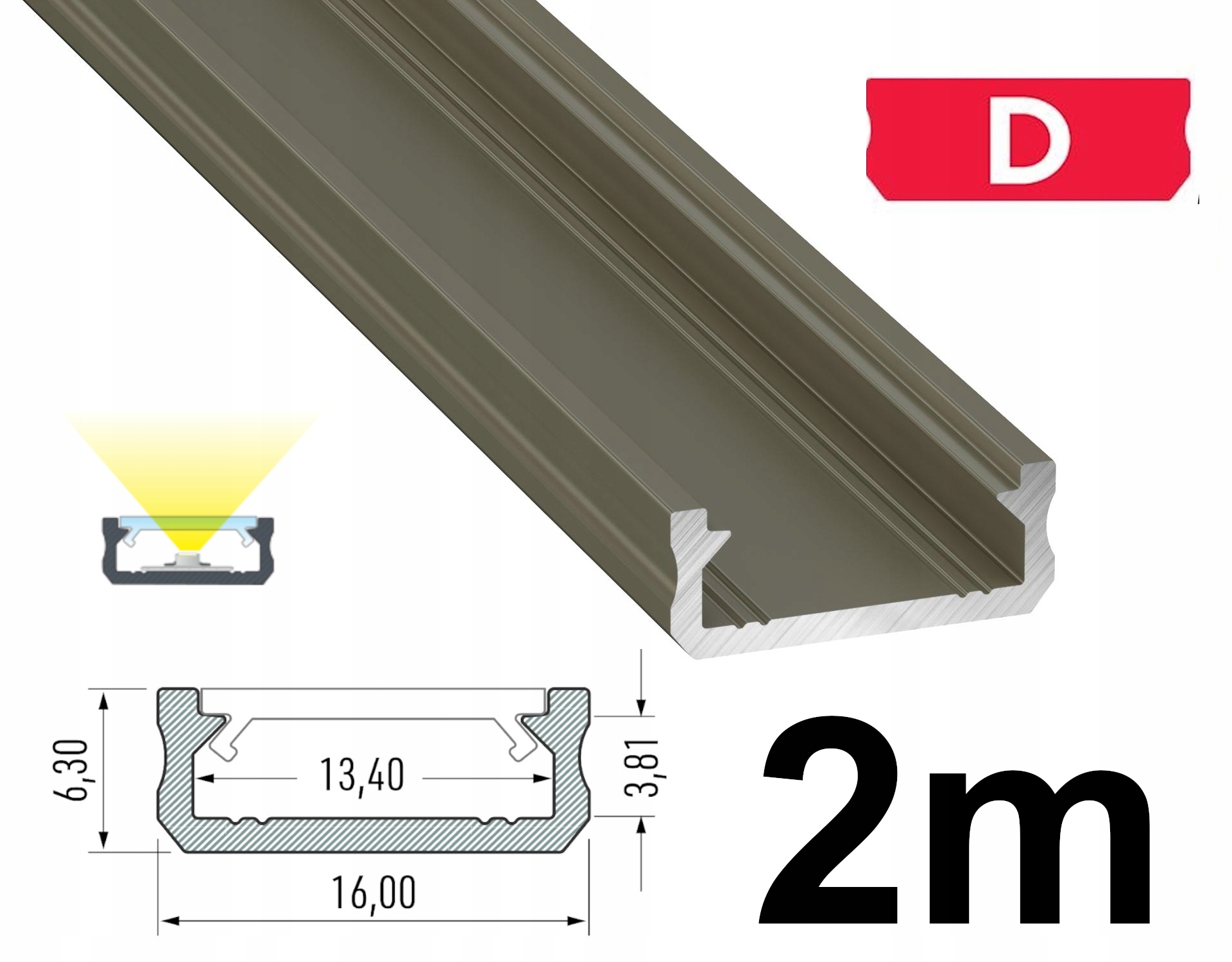ПОВЕРХНИЙ АЛЮМІНІЄВИЙ ПРОФІЛЬ ДЛЯ СВІТЛОДІОДНОЇ СТРІЧКИ ТИП D 2M АНОДИРОВАНИЙ INOX
