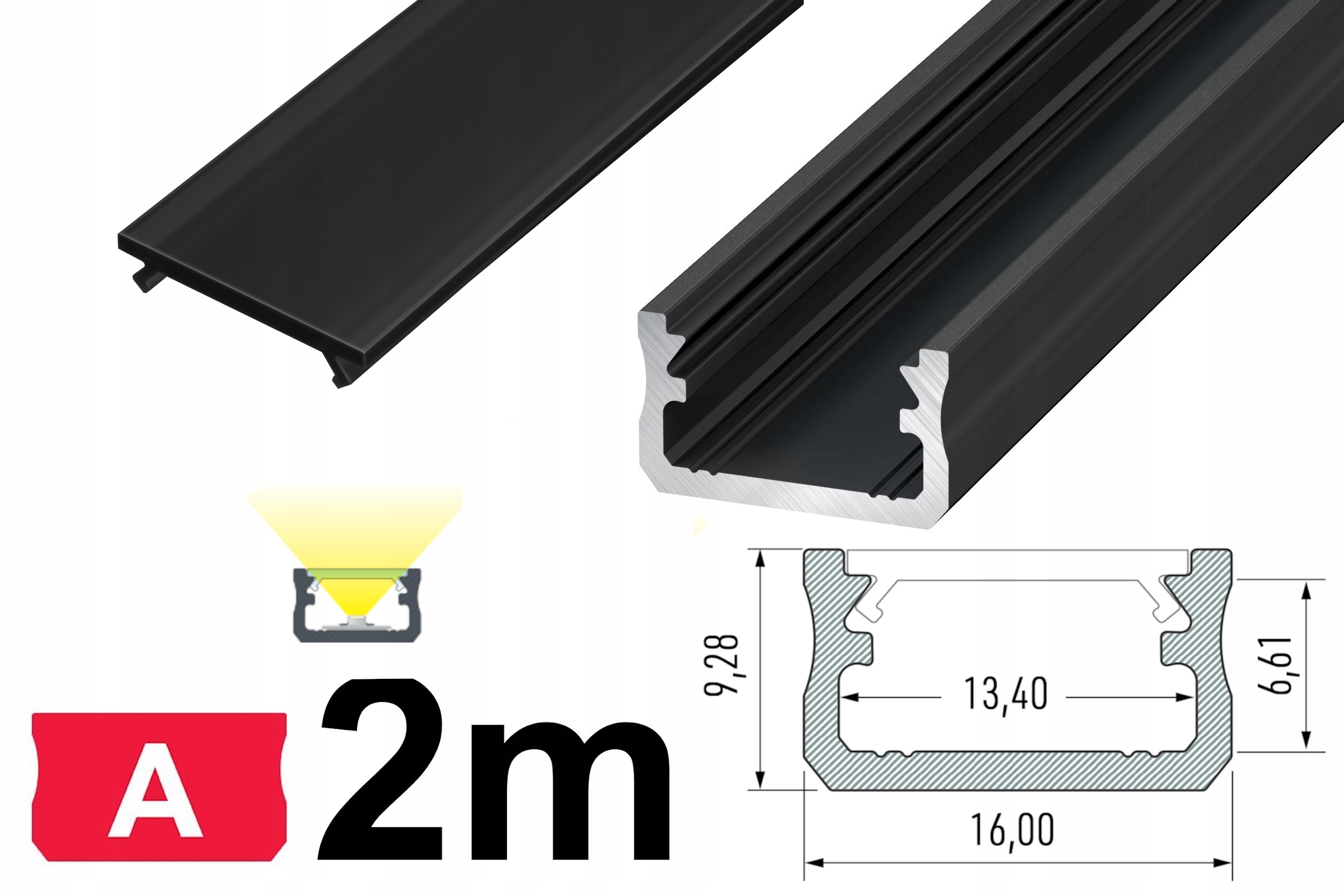 ПОВЕРХНИЙ АЛЮМІНІЄВИЙ ПРОФІЛЬ ДЛЯ СВІТЛОДІОДНОЇ СТРІЧКИ ТИП A 2M ЧОРНИЙ АНОДОВАНИЙ + ЧОРНИЙ РОЗСІЮВАЛЬНИК PMMA