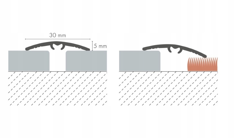 Профіль, повністю виготовлений із ПВХ, забезпечує винятково естетичне покриття для з’єднання різних поверхонь підлоги. Це ідеальне рішення для поєднання килимів з паркетом або теракотою, тим більше, що виключає будь-які перепади рівнів. Безперечною перевагою цього профілю є непомітний спосіб його кріплення до землі. Профіль покритий дуже міцним ламінатом з високим ступенем стійкості до стирання.