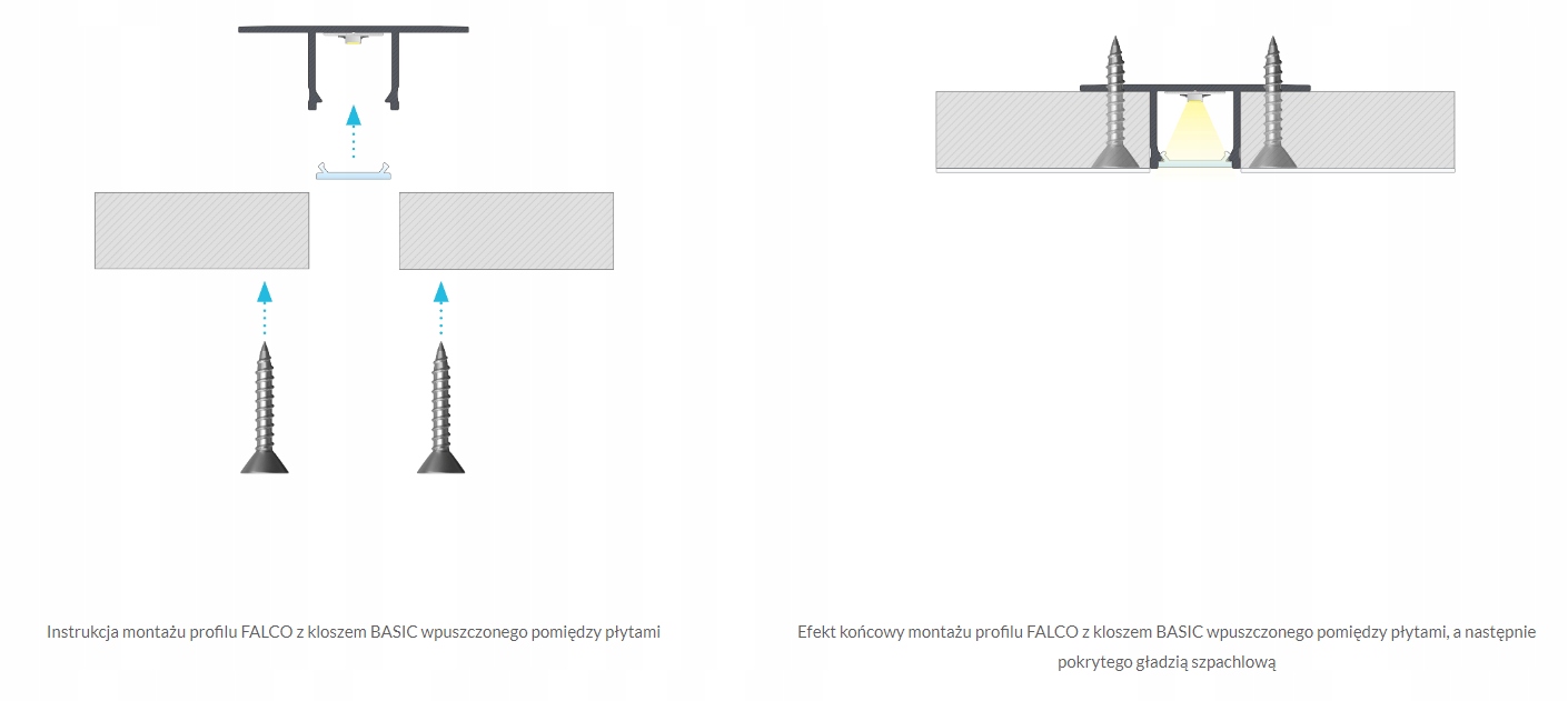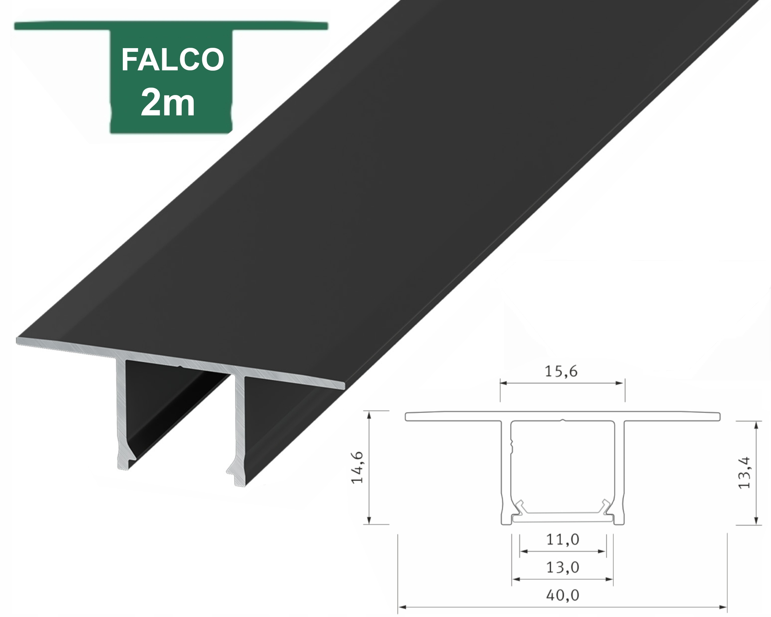 Алюмінієвий профіль типу FALCO призначений для вбудованої установки з широким спектром застосування. Одиночний світлодіодний профіль для установки між двома гіпсокартонними плитами. Це дозволяє швидко встановити за допомогою шурупів і завершити шпаклівкою без необхідності використання монтажної сітки.