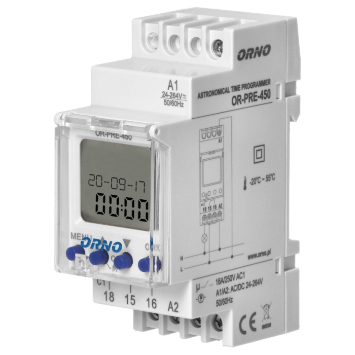 АСТРОНОМІЧНИЙ ПРОГРАМАТОР Orno OR-PRE-450 дозволяє вмикати/вимикати живлення через певний проміжок часу, а 52 точки перемикання дозволяють регулювати налаштування відповідно до ваших індивідуальних потреб. p>