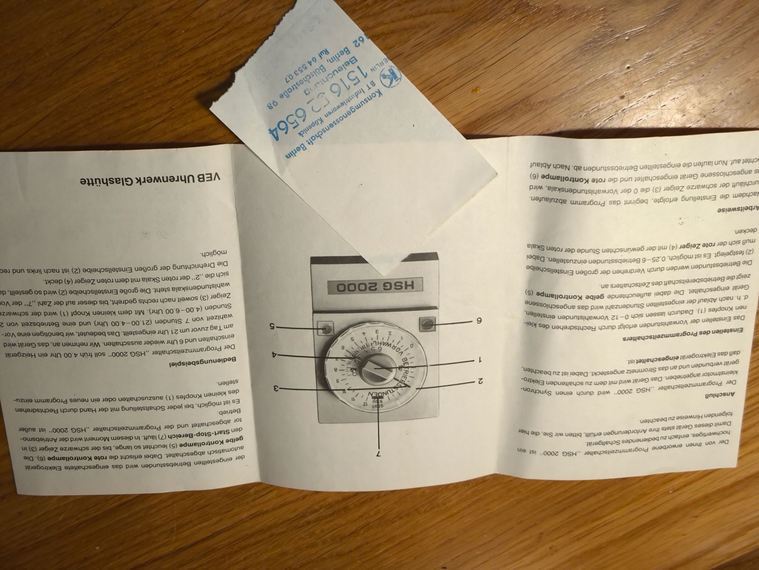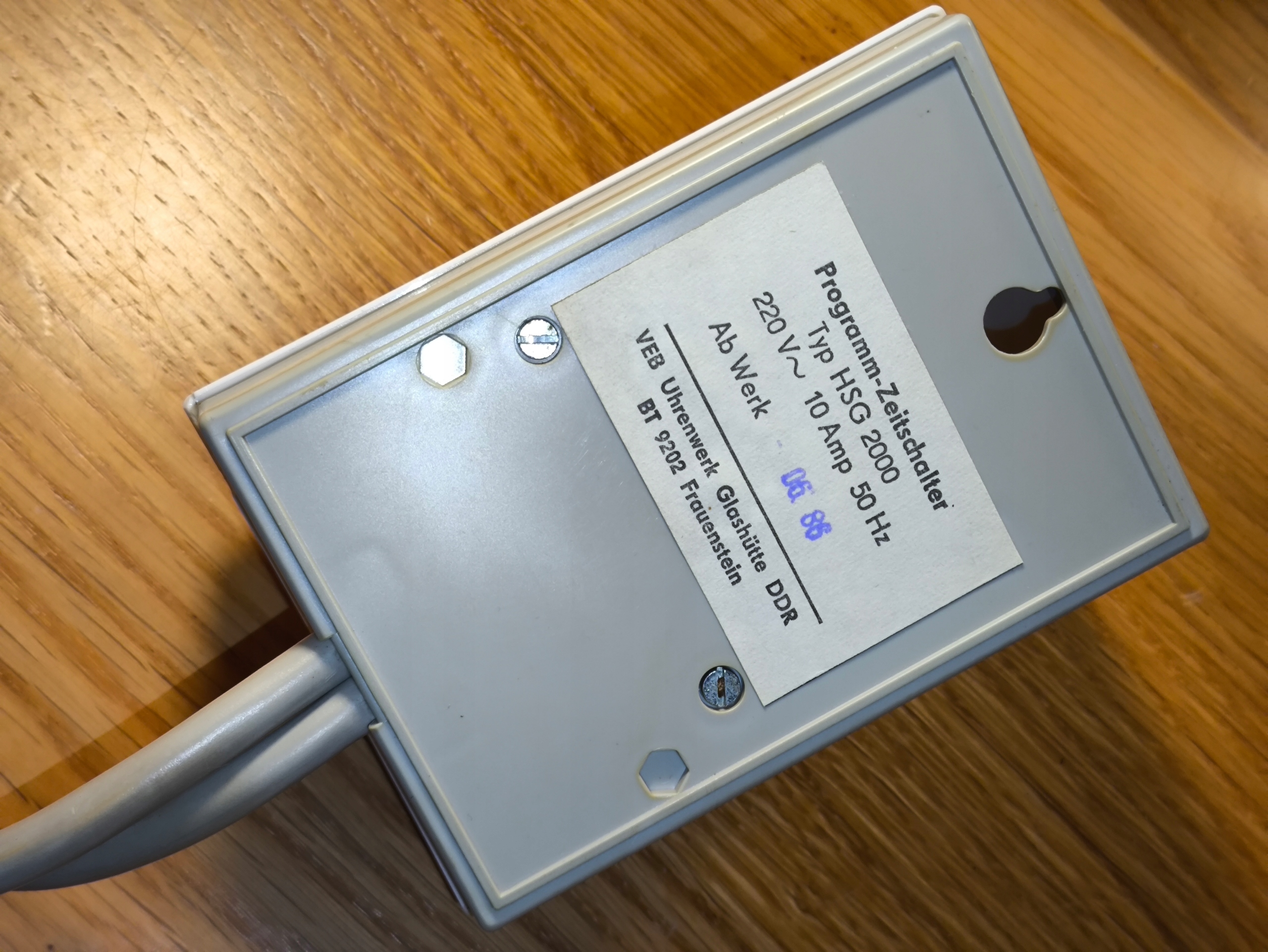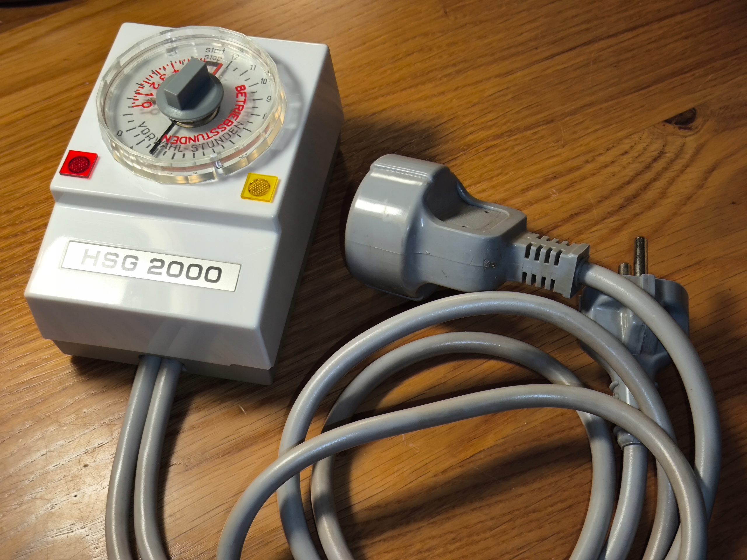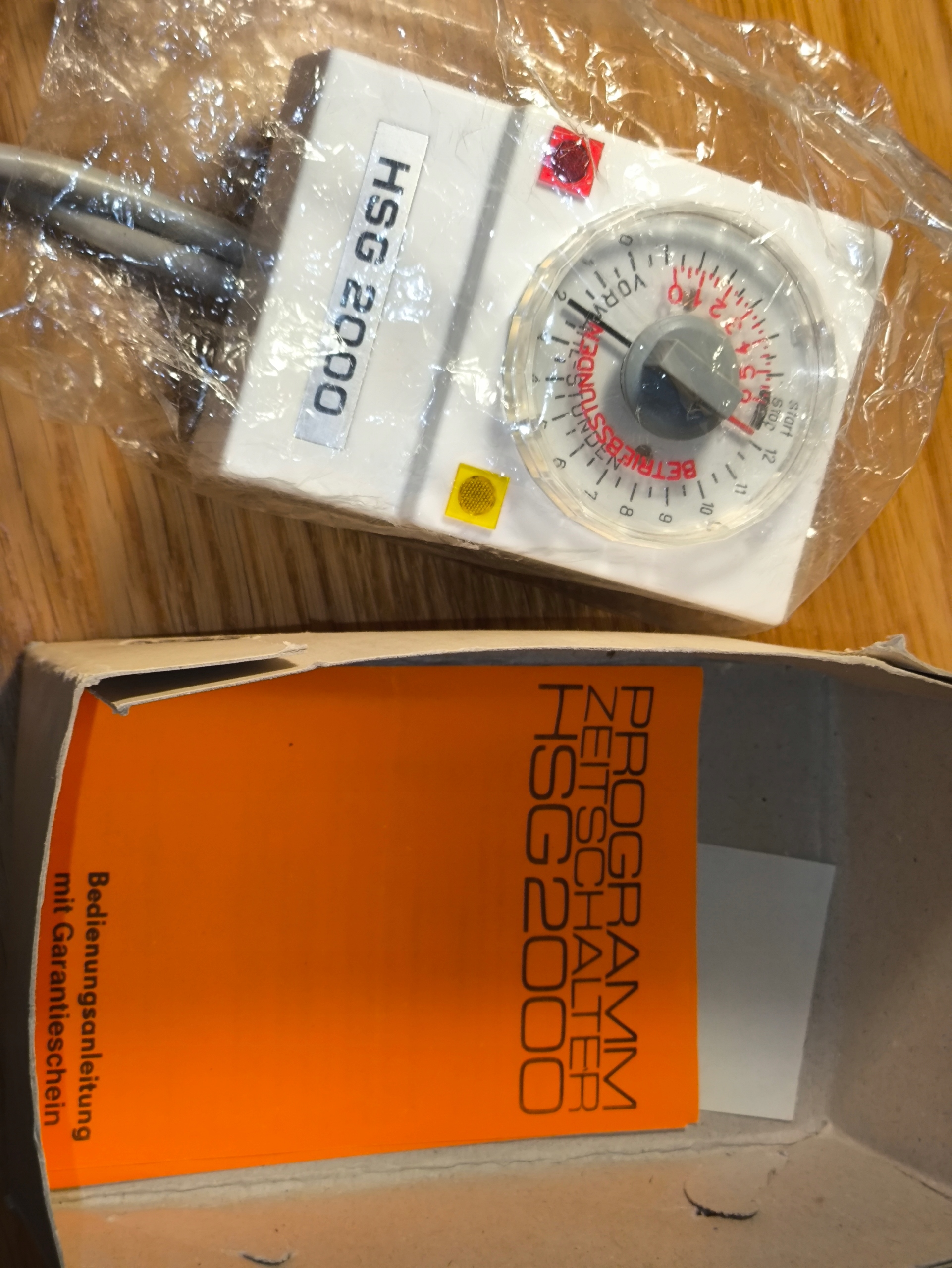 Таймер HSG 2000 — це електромеханічний годинник з керуванням, виготовлений компанією VEB Uhrenwerk Glashütte, що належить Kombinat Mikroelektronik у колишній НДР (DDR). Пристрій виготовлено в червні 1986 року, що підтверджується оригінальним гарантійним талоном з датою і печаткою торгової точки в Берліні. Програматор призначений для автоматичного вмикання та вимикання електроприймачів відповідно до запрограмованого часового циклу.