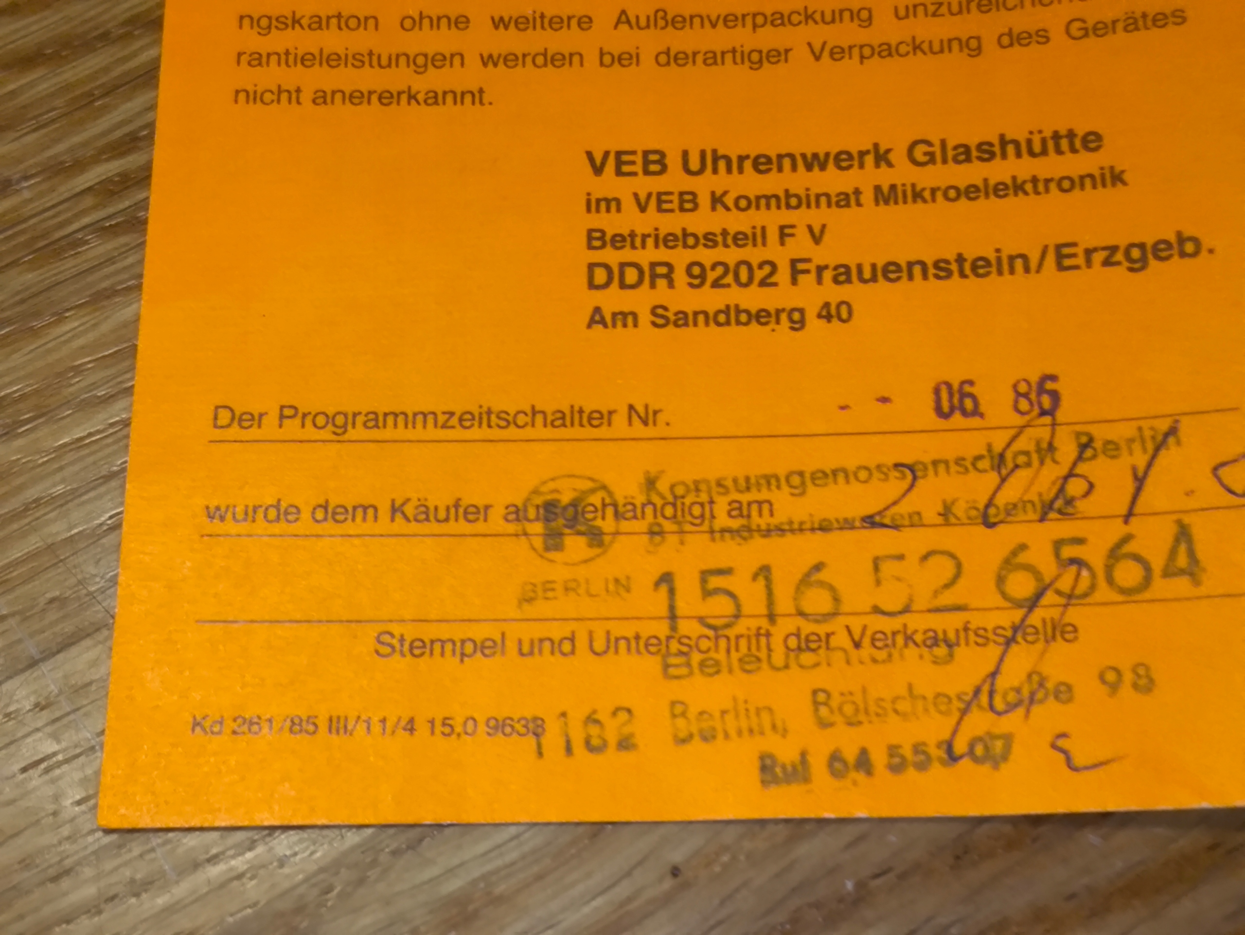 - Виробник: VEB Uhrenwerk Glashütte, Betriebsteil F V, DDR 9202 Frauenstein/Erzgebirge