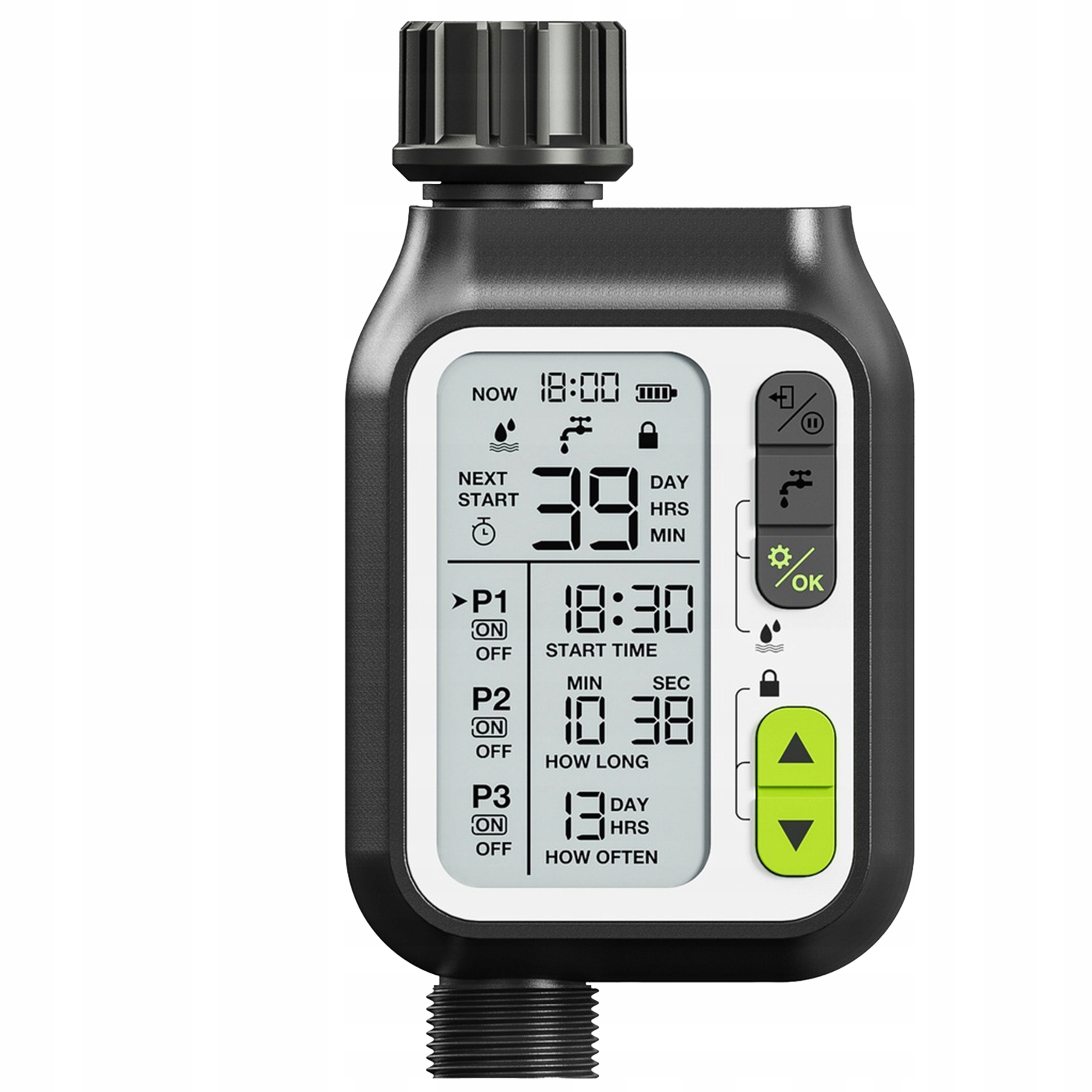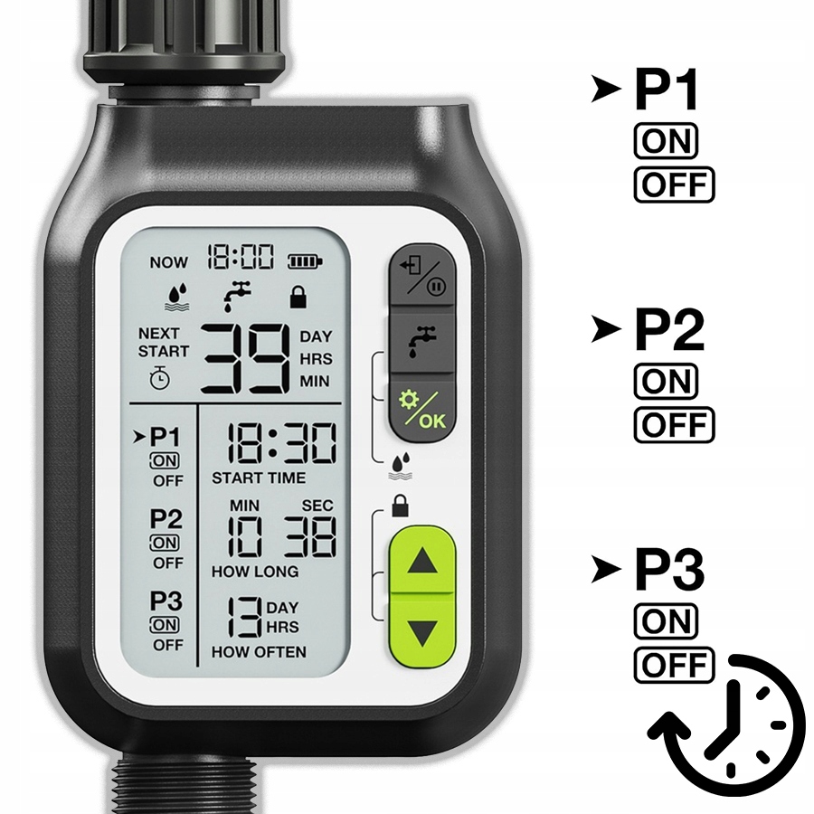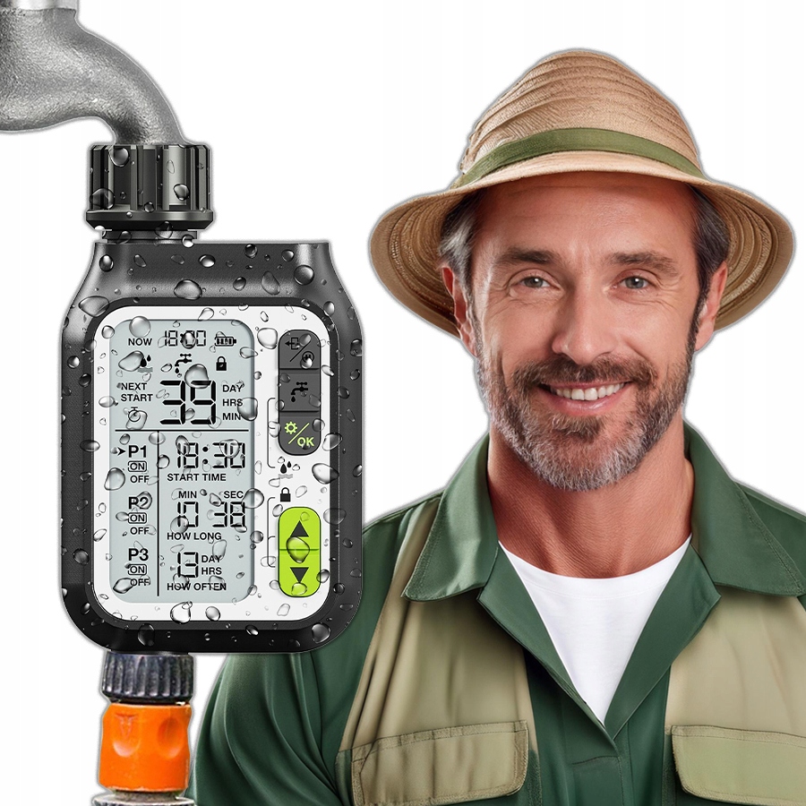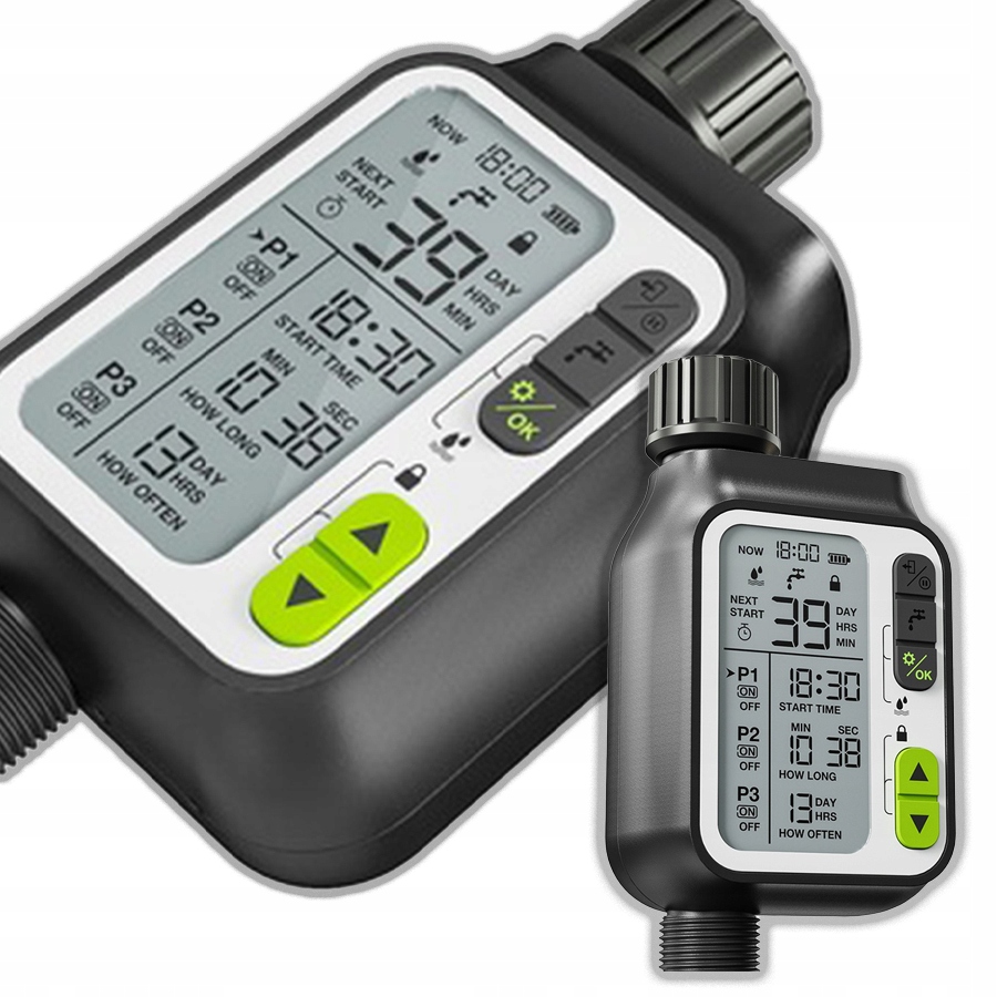 Сучасний контролер з чітким РК -дисплеєм гарантує легку та інтуїтивну роботу. Побудований датчик дощу інтелектуально економить воду, вимикаючи систему у разі опадів. Три щоденні програми дозволяють точно узгодити графік поливу індивідуальним потребам вашого саду.
