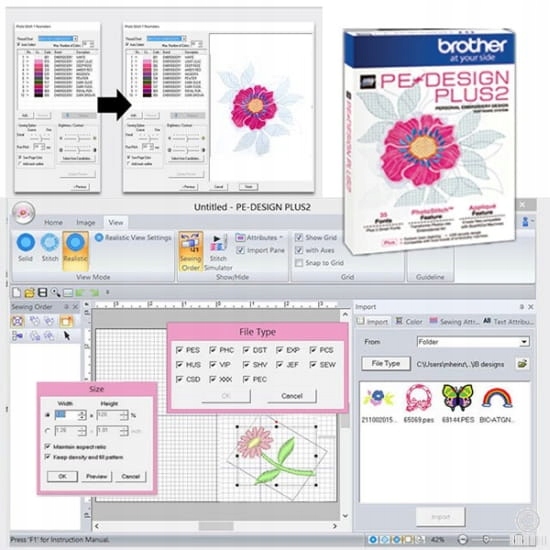 Програма характеризується дуже вигідним співвідношенням ціни та якості. Він має багато вбудованих функцій і можливостей, зокрема: модуль напису, згадана функція буквально за кілька секунд автоматичного перетворення графічних файлів і фотографій у вишивку (PhotoStitch) і конвертації кліпартів у вишивку (AutoPunch) і — що вкрай рідко зустрічається серед подібних програм — модуль дизайну ручної вишивки. Brother PED PLUS 2 має аж 35 вбудованих шрифтів, у тому числі 5 шрифтів для дуже дрібних написів, інструменти для малювання та лічильник стібків, який показує кількість стібків у конкретному проекті та на основі цього вказує приблизний час вишивання. їх. Він дозволяє експортувати та імпортувати файли в багатьох форматах, наприклад: .vip, .pes, .xxx, .jef, .pcs, .csd, .dst, .sew і .exp. Він дозволяє змоделювати на екрані комп’ютера, дозволяючи перевірити, як буде виглядати вишивка в реальності. У програмі також можна редагувати порядок вишивання окремих об'єктів, а також змінювати параметри стібків, змінюючи їх щільність або додаючи підкладки. Brother PED PLUS 2 — програма, рекомендована для початківців, яка є функціональним доповненням до першої вишивальної машини.