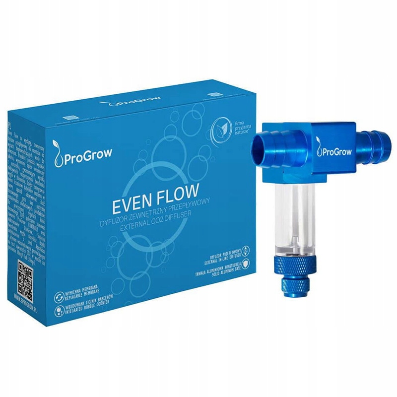 Дифузор ProGrow Even Flow – це зовнішній дифузор вуглекислого газу, призначений для роботи з ковшовими фільтрами. Дифузор розміщується на лінії подачі води в акваріум і підключається до набору CO2. Завдяки використанню потоку води та найякіснішій керамічній мембрані він характеризується чудовою розчинністю вуглекислого газу.