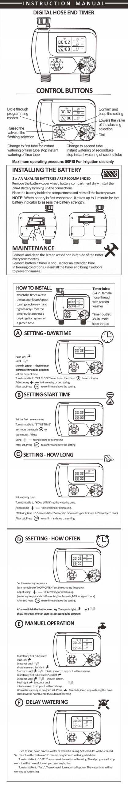 1. [Полив часу] Тривалість поливу можна встановити від 1 хвилини до 300 хвилин; Частоту поливу можна встановити з кожні 6 або 12 годин до 7 днів.