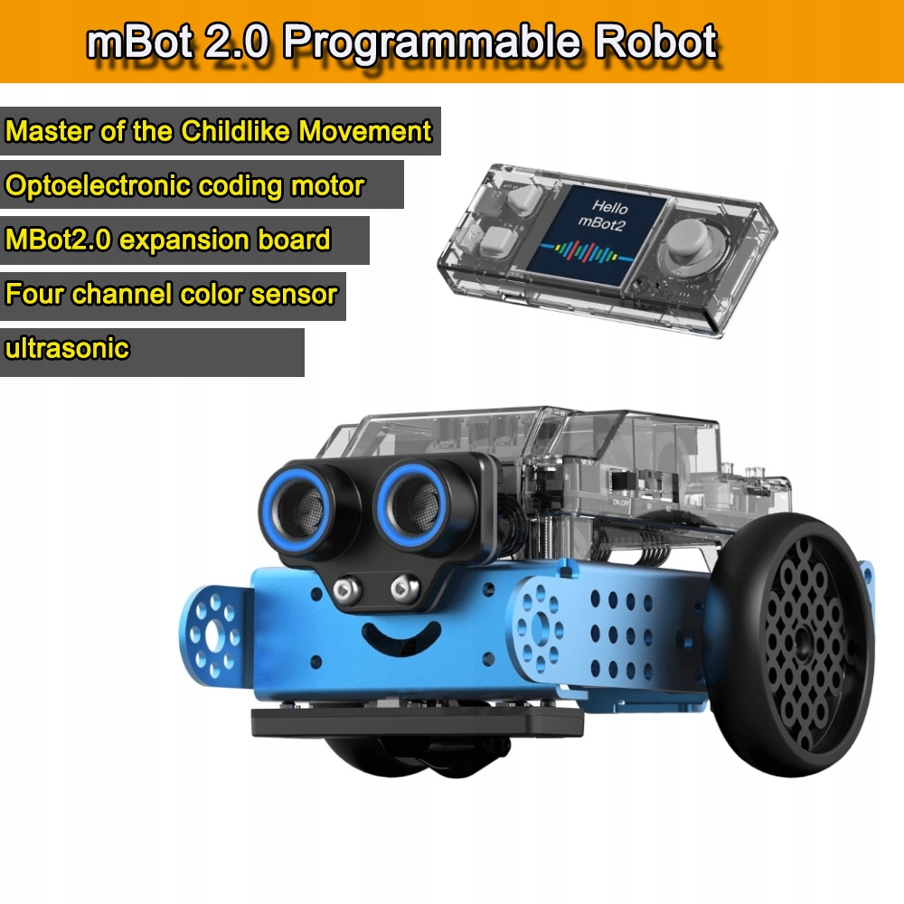 Удосконалена електроніка: mBot2 оснащений ультразвуковим датчиком наступного покоління з інтегрованим освітленням і датчиком Quad RGB, який використовує чотири кольорові датчики для одночасного визначення кольорів і ліній доріжки. Це покращує роботу робота. mBot2 можна додатково розширити за допомогою широкого асортименту будівельних деталей Makeblock Education та інтелектуальних електронних модулів серії mBuild.
